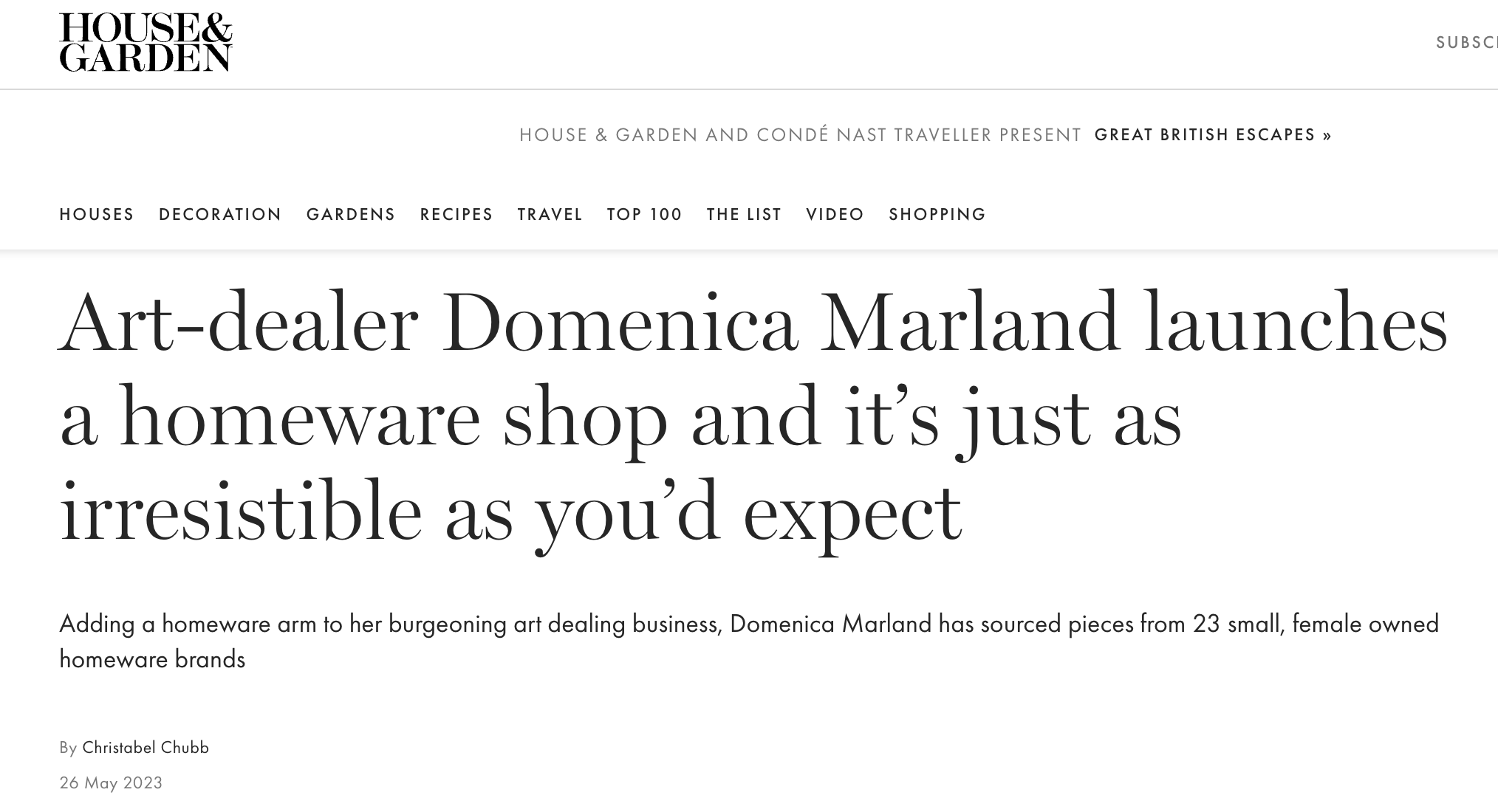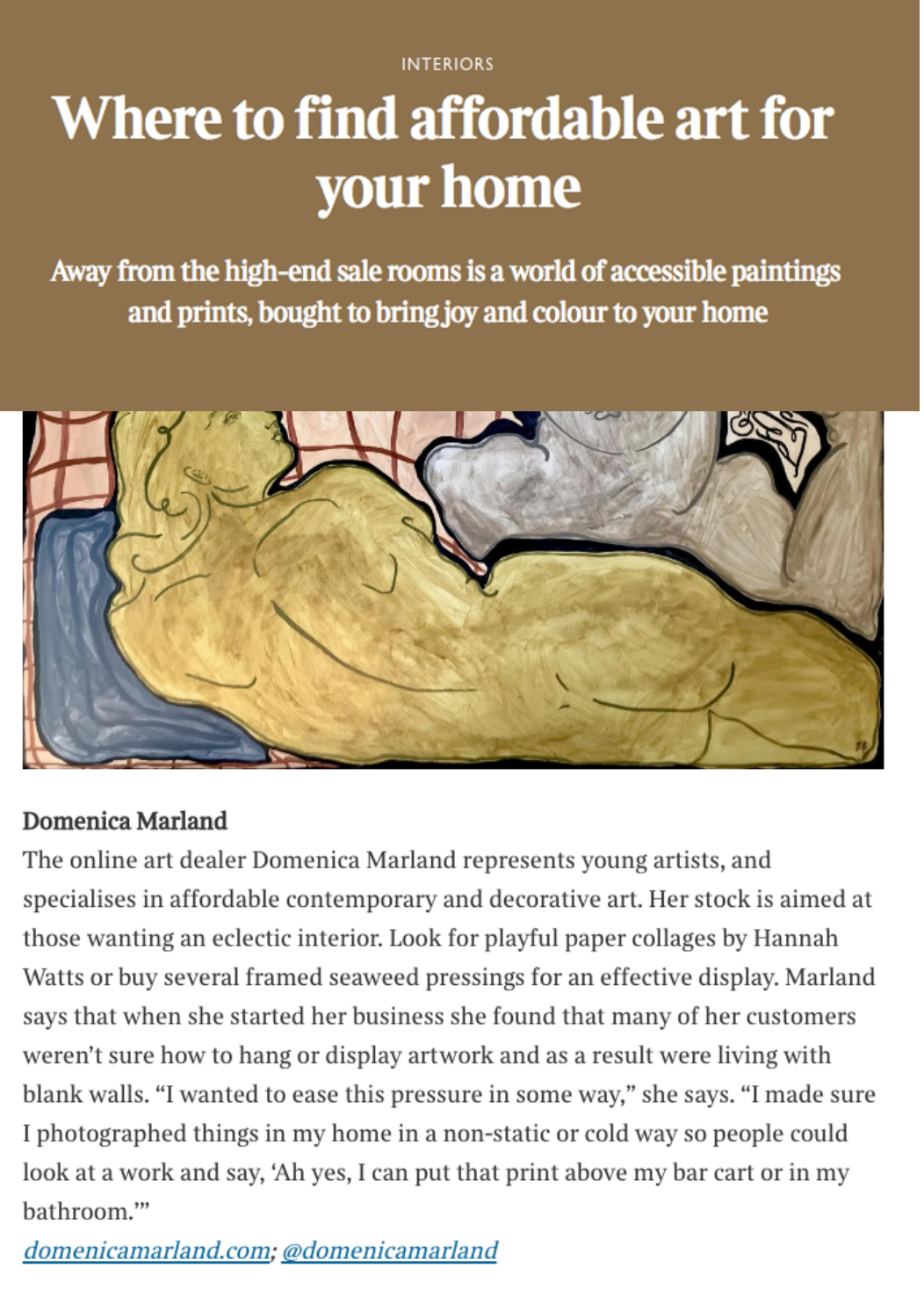 Founded in 2018, art dealer Domenica Marland launched an online gallery and homeware shop that aims to sell affordable and decorative homeware pieces. Through sourcing artworks that are unique and representing contemporary artists Domenica has established a programme that is accessible and engaging.
