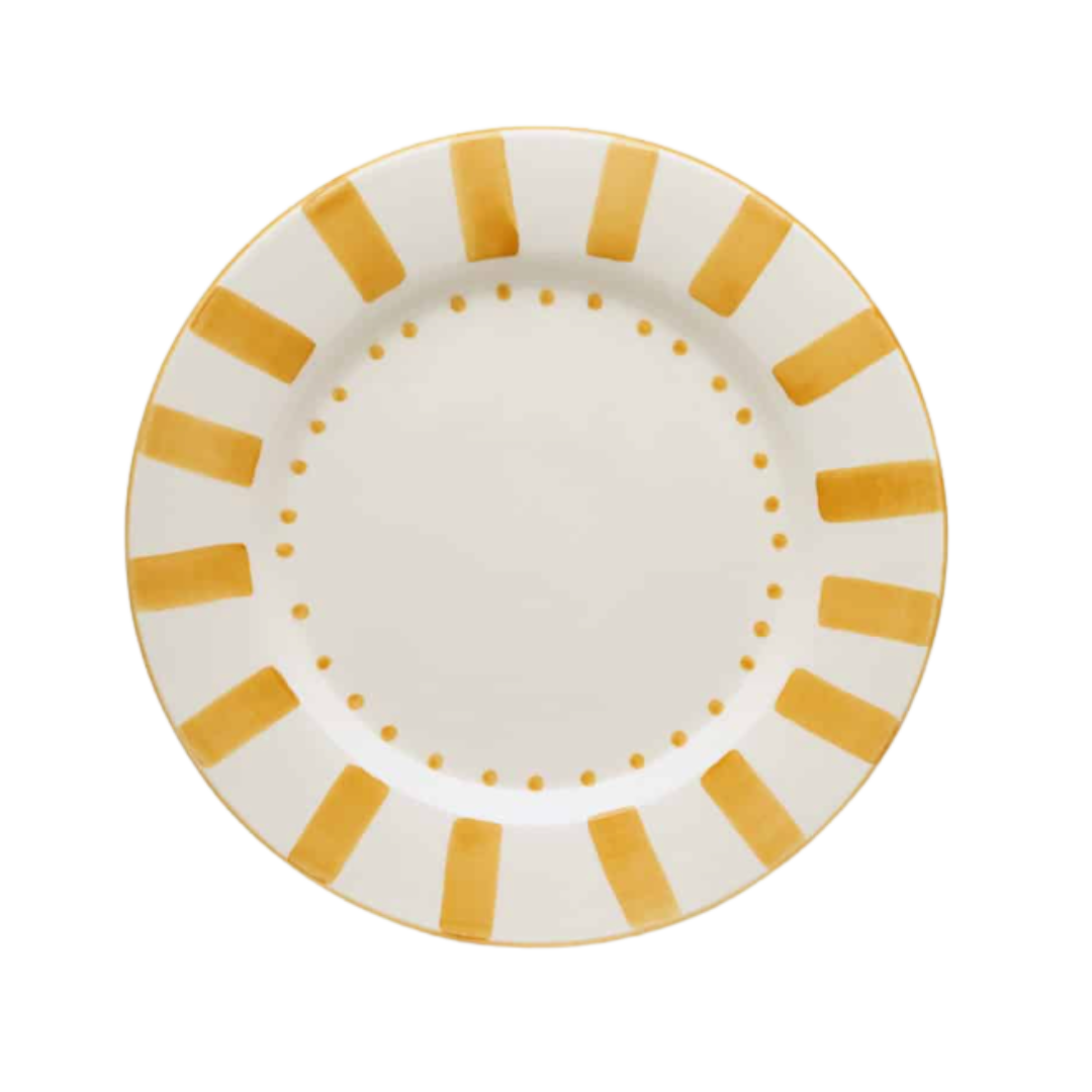 Hand painted ceramic dinner plate featuring a yellow striped and dotted design. Perfect for enhancing your table and mixing and matching with other pieces for a unique style.
