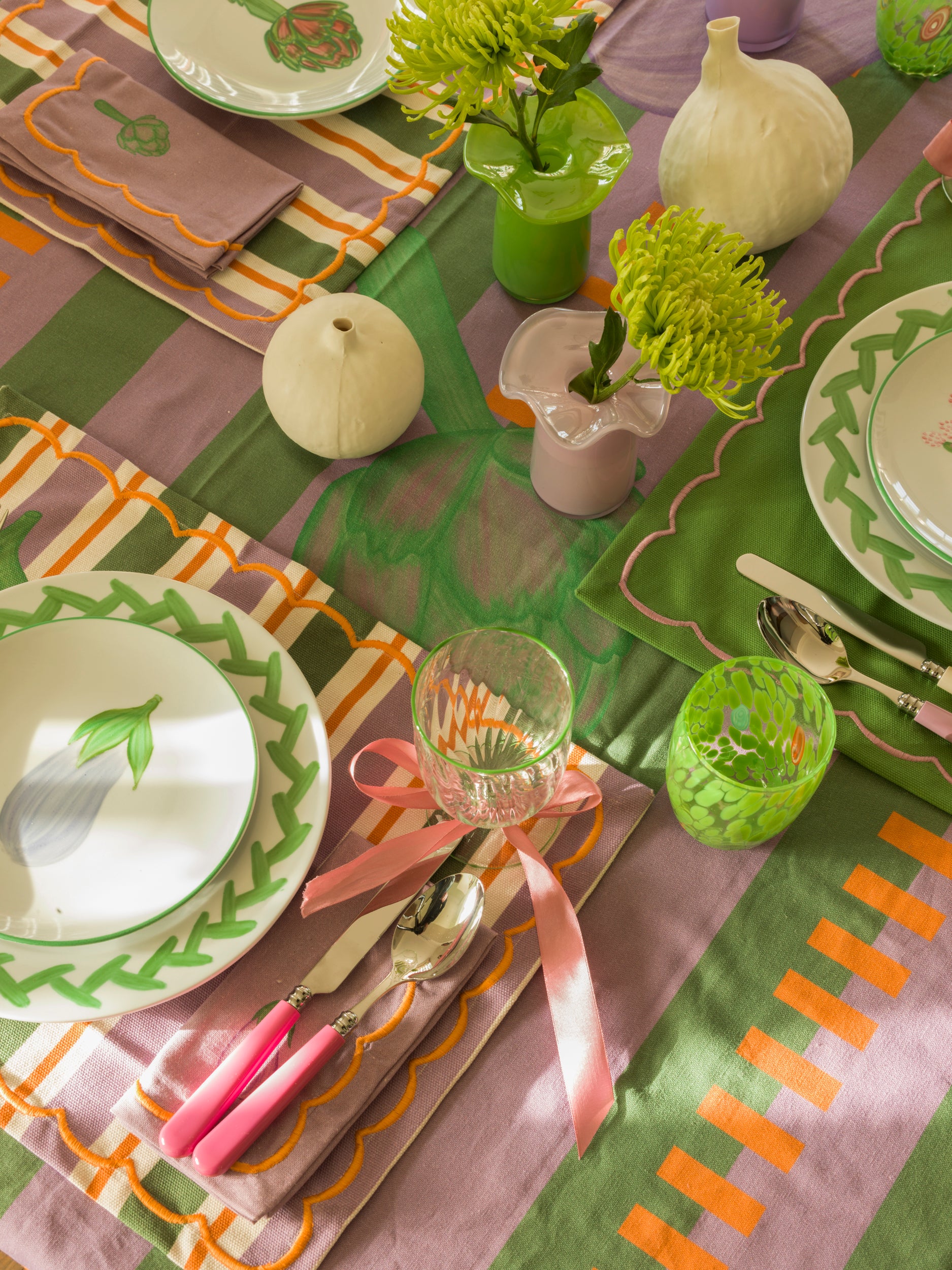 Decorated with 4 veggies over green stripes and a wave embroidery border in orange, this placemat is bright and bold.