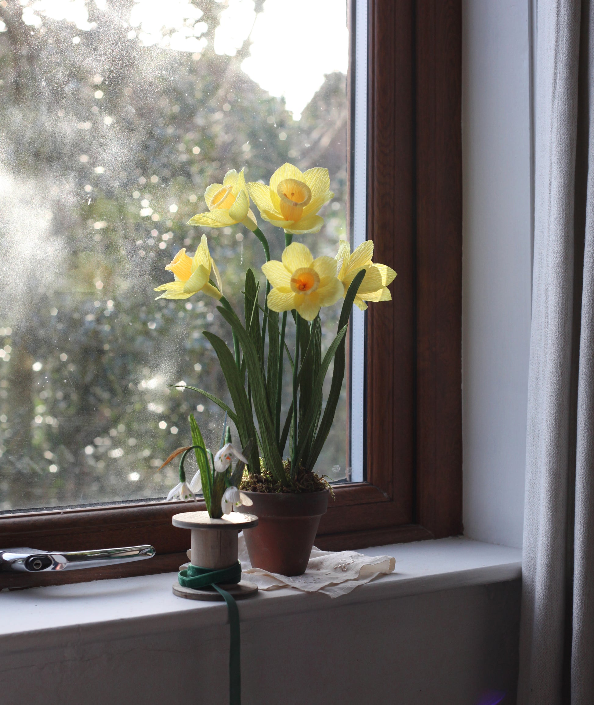 These Paper Daffodils, "planted" in an aged terracotta pot, have been meticulously handcrafted from Italian crepe paper. It measures approximately 45 cm tall and 25 cm wide