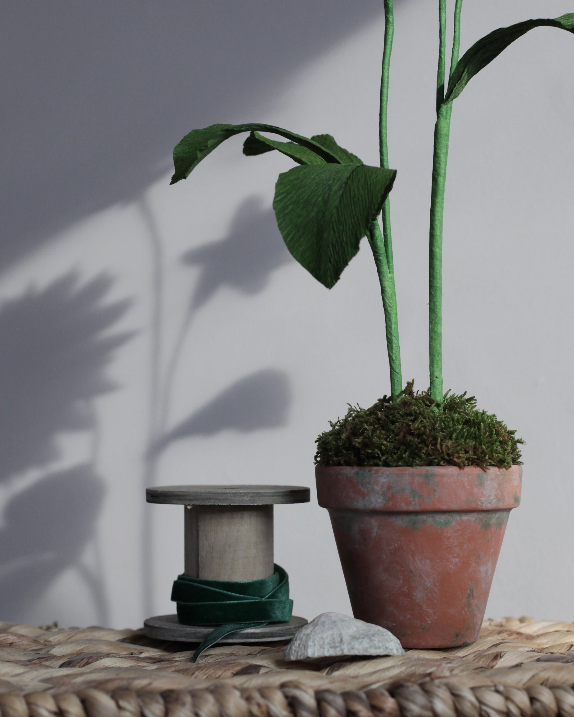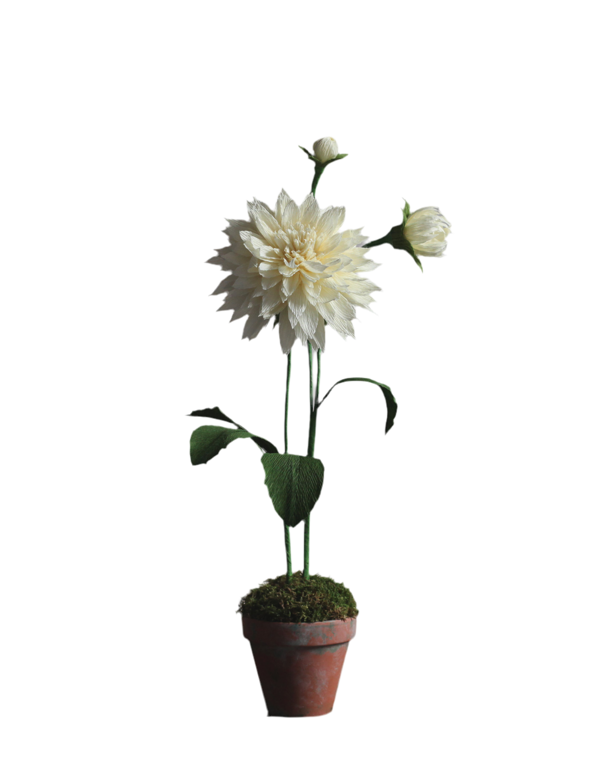 Nestled in a weathered terracotta pot, filled with preserved moss, this handcrafted paper flower lends a sense of enduring beauty to any setting. Measuring approximately 45 cm tall and 20 cm wide, it is the perfect statement piece to grace a writing desk, a bedside table, or any cherished space.