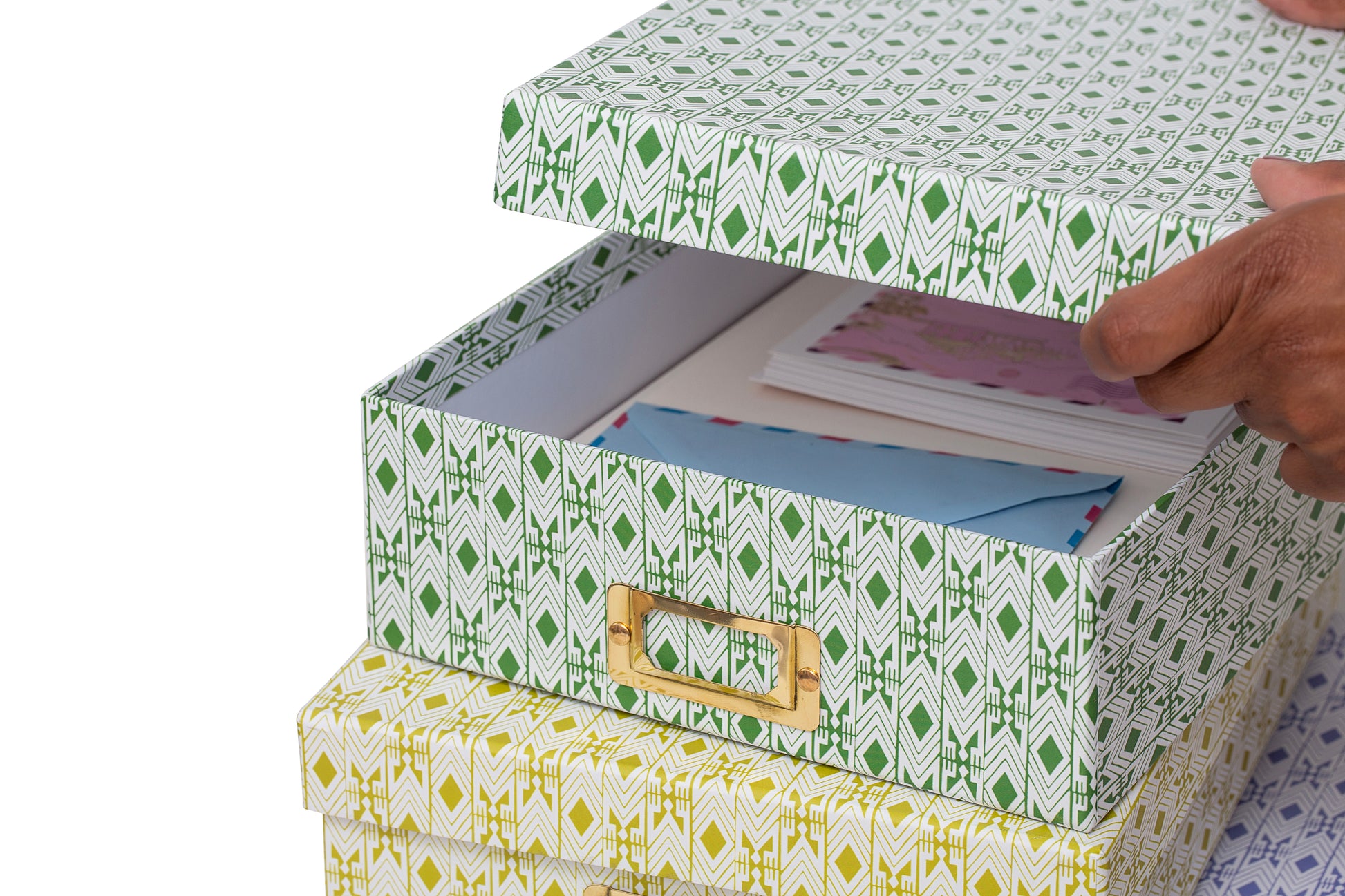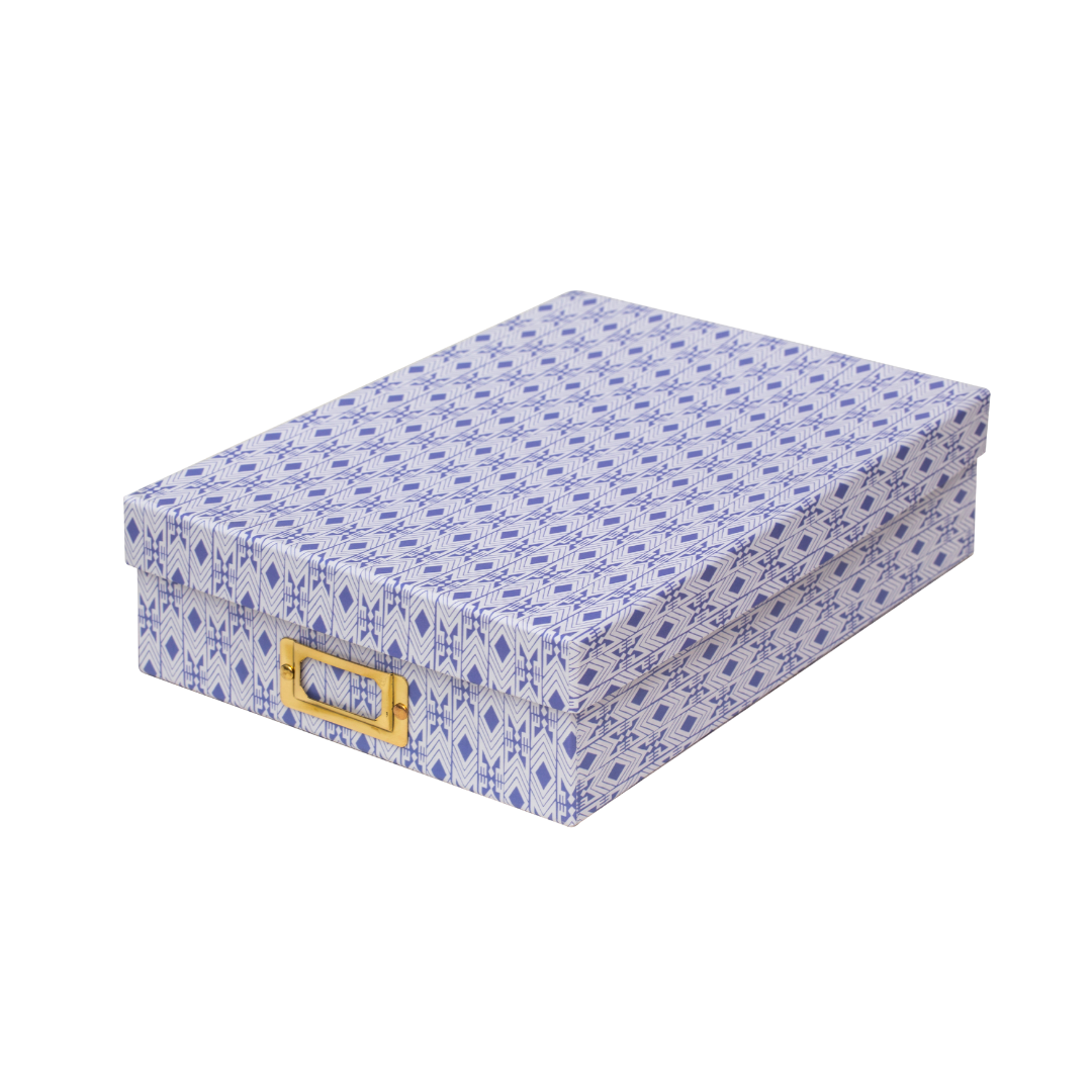 The Lidded Portfolio Box has a brass card frame at the front and fits up to A4 papers and objects.