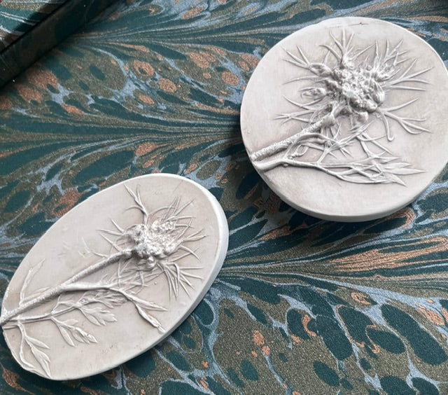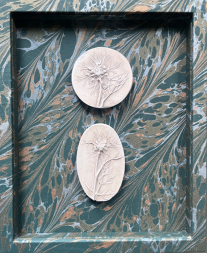 Fi McDougall of Wilderframe and Katy Eccles of Imprint Casts have collaborated on a second small collection of miniature, plaster-cast intaglios in wrapped frames. The casts are created by Katy, using the imprints of real snowdrops, and Fi frames them in sold wood frames she has wrapped in carefully selected, traditionally marbled paper.