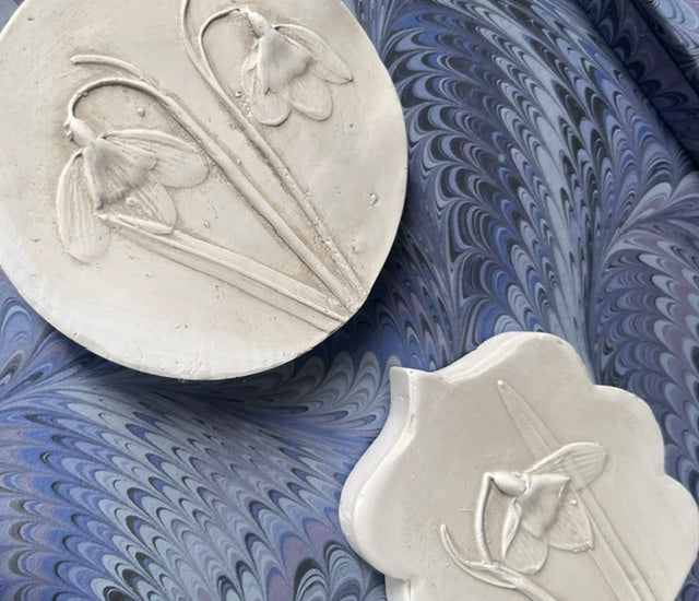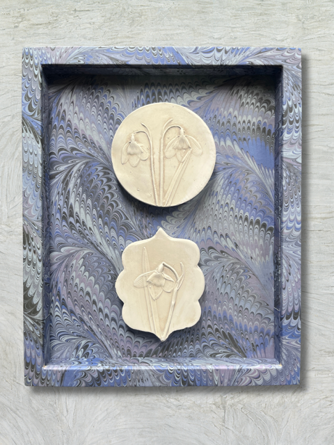Fi McDougall of Wilderframe and Katy Eccles of Imprint Casts have collaborated on a second small collection of miniature, plaster-cast intaglios in wrapped frames. The casts are created by Katy, using the imprints of real snowdrops, and Fi frames them in sold wood frames she has wrapped in carefully selected, traditionally marbled paper.