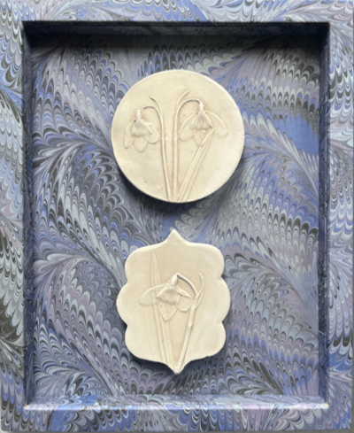 2 plaster cast intaglios of snowdrops, cast from real flowers. Framed in a solid wood frame, wrapped in printed marbled paper. Glazed with anti-reflective art glass.