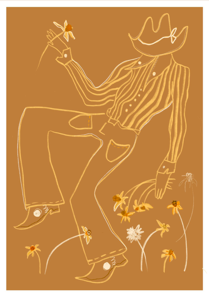 The first collection, ‘Dancing in the Desert’, is now 10 prints strong. Flamboyantly-dressed cowboys and their desert-dwelling friends are depicted in dreamy natural settings, the colours and style akin to those you might find in a children’s book with a grown-up twist. Each one is inspired by a moment from a book, film, song or memory, the title giving an insight into a story it’s up to the viewer to tell in full.