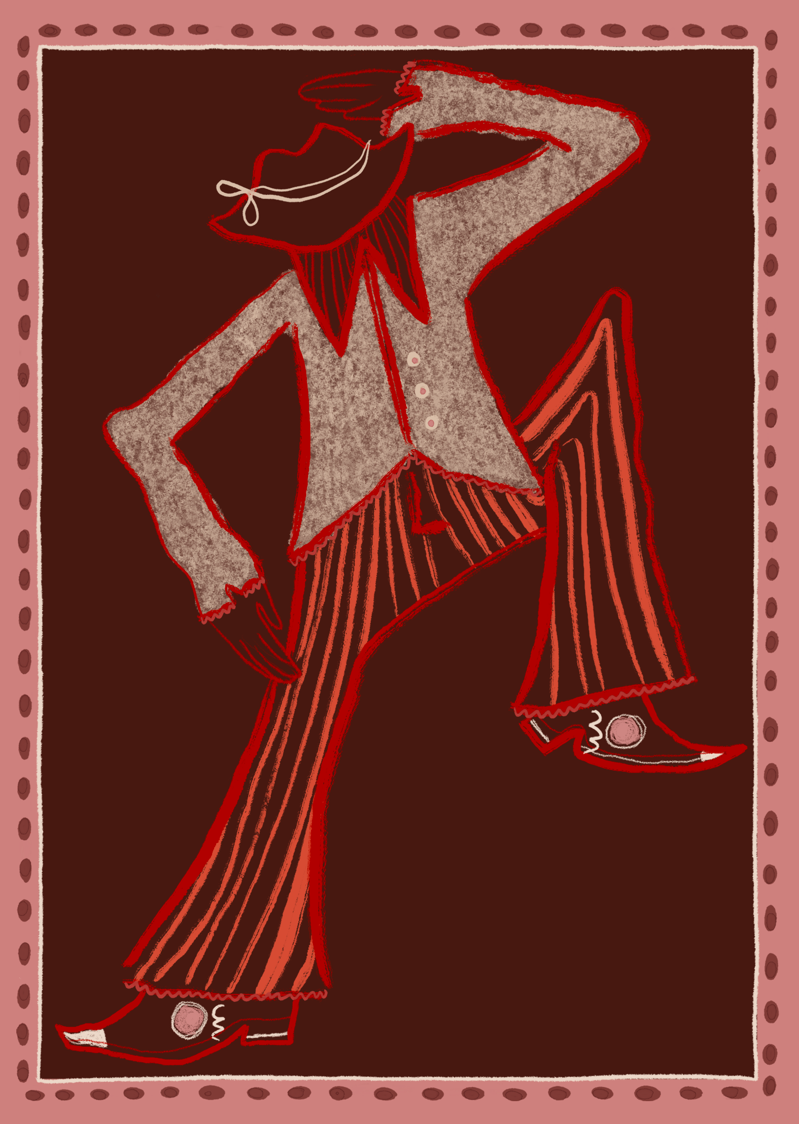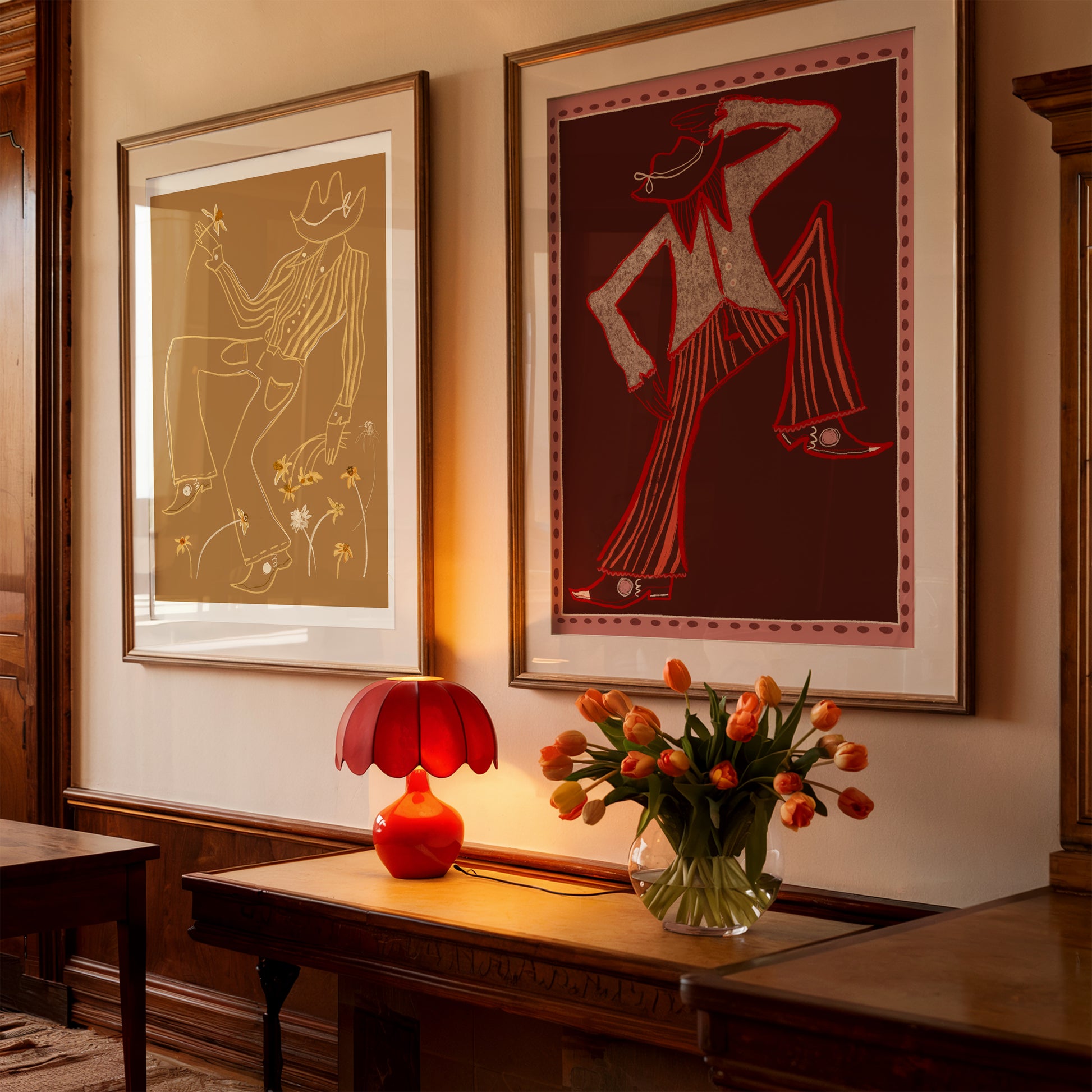 The first collection, ‘Dancing in the Desert’, is now 10 prints strong. Flamboyantly-dressed cowboys and their desert-dwelling friends are depicted in dreamy natural settings, the colours and style akin to those you might find in a children’s book with a grown-up twist. Each one is inspired by a moment from a book, film, song or memory, the title giving an insight into a story it’s up to the viewer to tell in full.