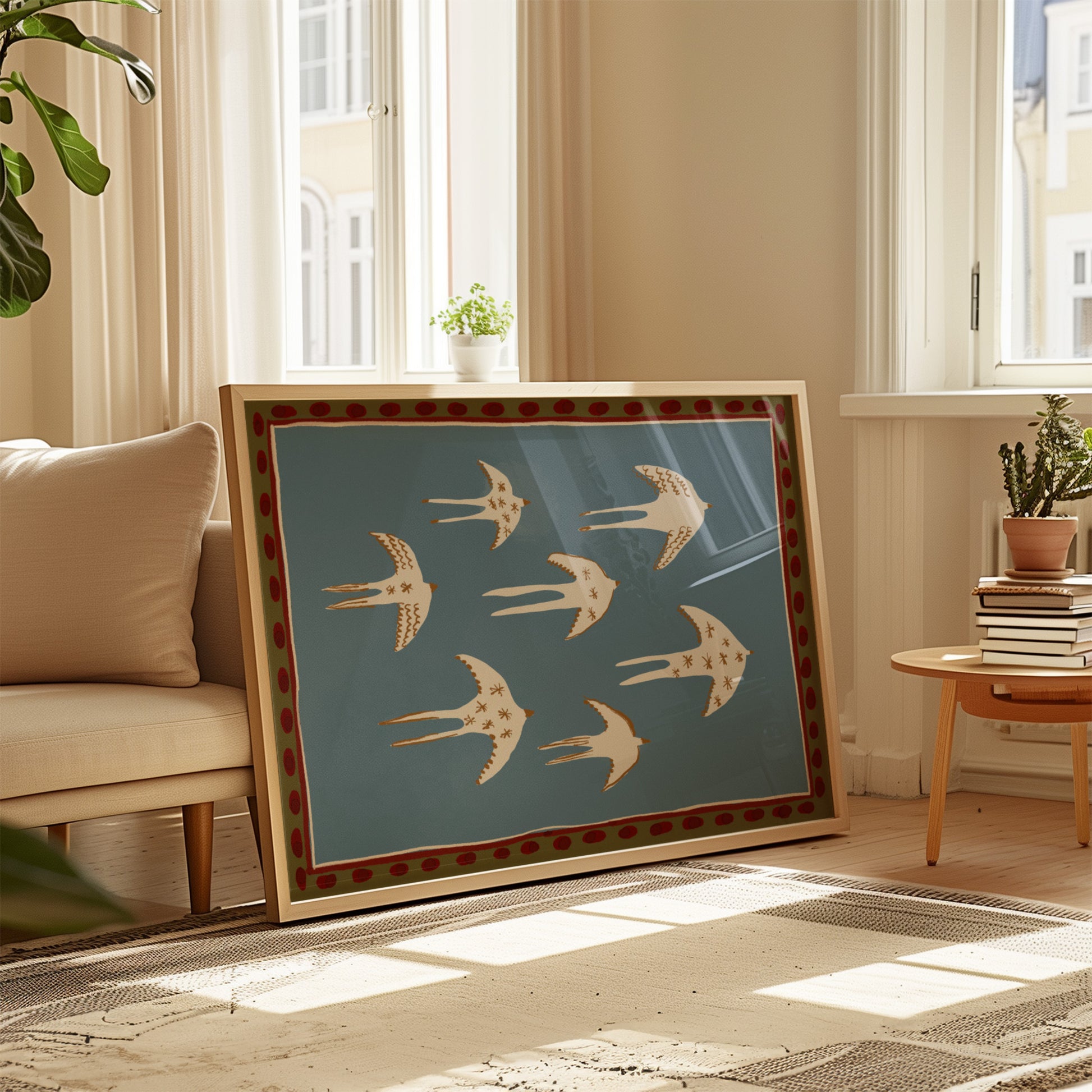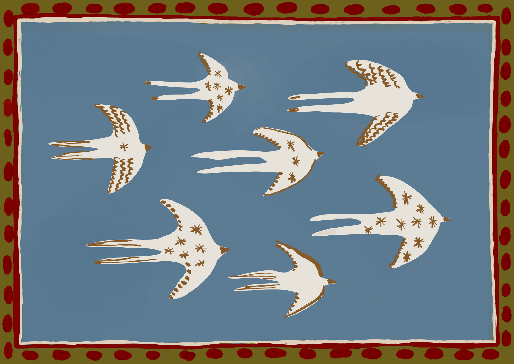 The first collection, ‘Dancing in the Desert’, is now 10 prints strong. Flamboyantly-dressed cowboys and their desert-dwelling friends are depicted in dreamy natural settings, the colours and style akin to those you might find in a children’s book with a grown-up twist. Each one is inspired by a moment from a book, film, song or memory, the title giving an insight into a story it’s up to the viewer to tell in full.
