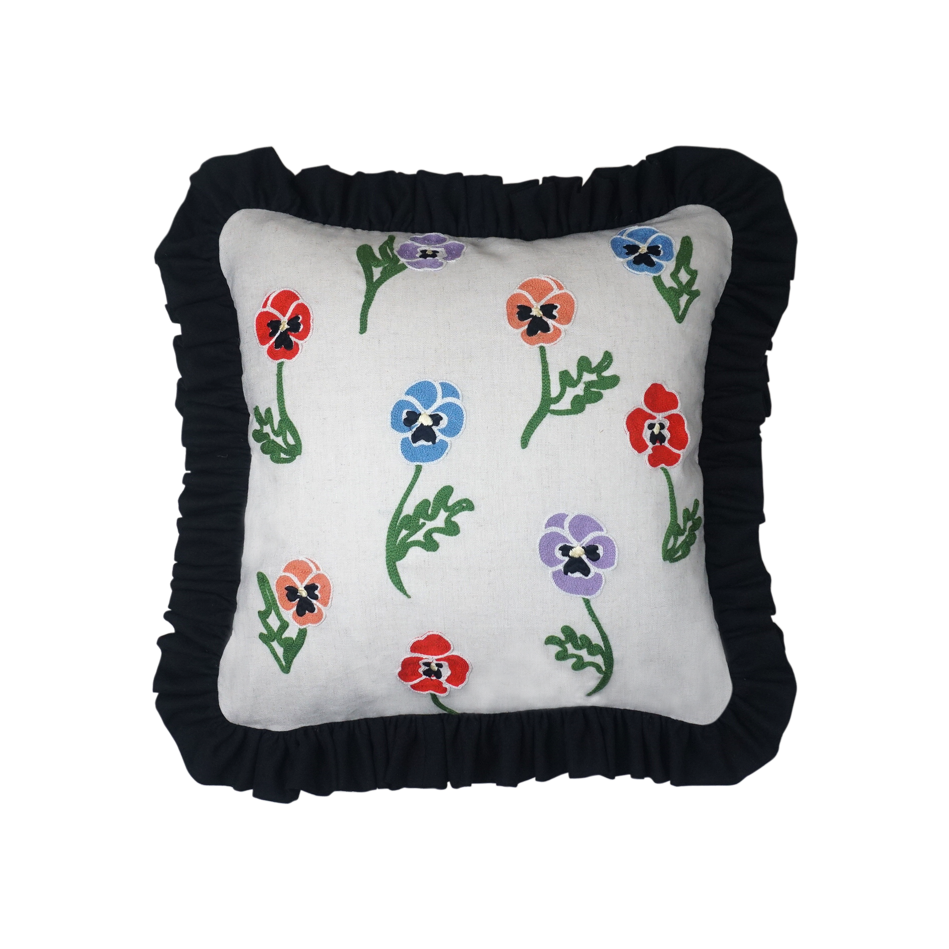 Handmade embroidered cushion with a 5cm ruffle made in black irish linen. The cushion itself is made from a oatmeal linen and features chainstitch embroidery.