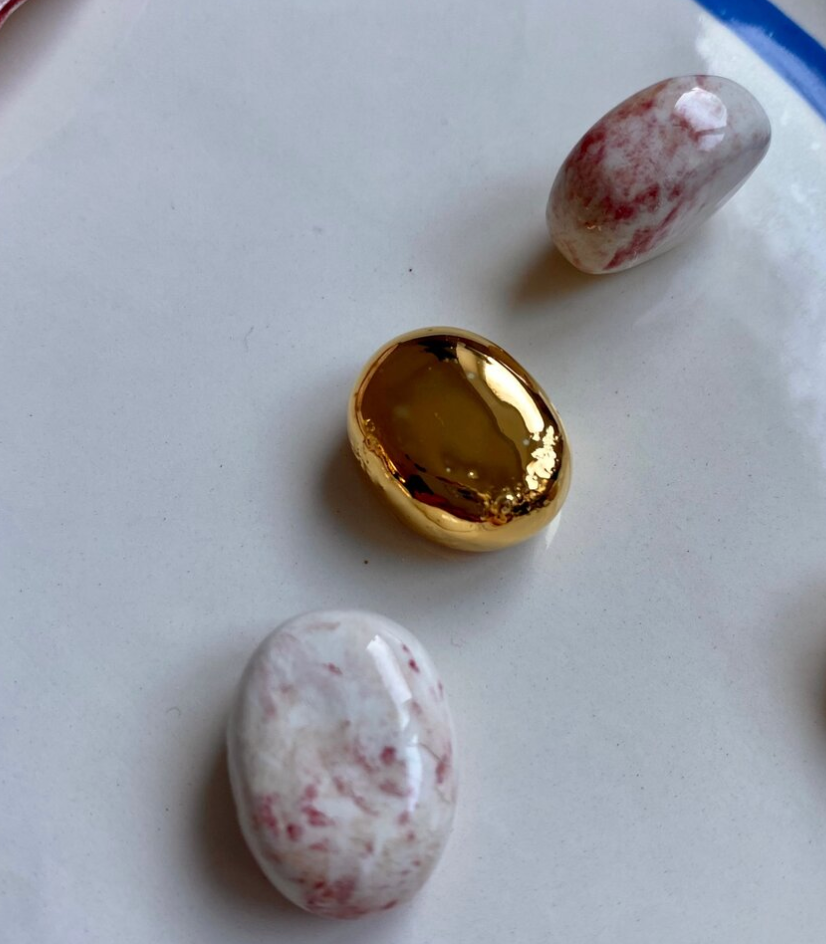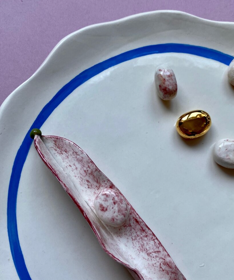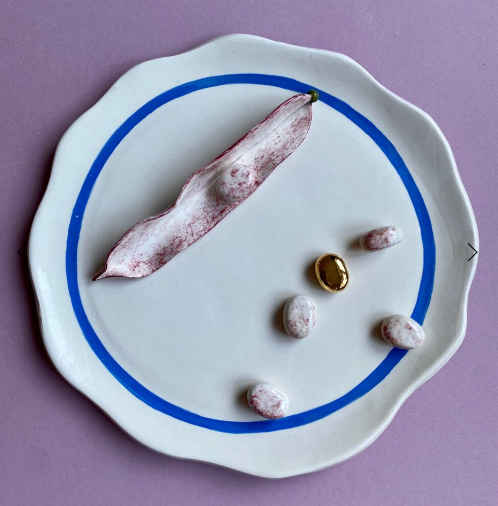 “As a tiny child Minnie-Mae Stott was taken to Hackney’s Ridley Road market. There she was dazzled by the old Eastenders with their watercress bunches, peas and broad beans, the Indian stalls with Alphonso mangoes and okra, and the Jamaican ones with sugar cane and scotch-bonnet chillies. It wasn’t just the delicious food on display but the colours, shapes and patterns that animated her imagination. Now her Margate studio teems with the same bounty, albeit in ceramic form: red radish table decorations, golden peas in a pod, pears painted on to plates. They’re tactile things; you want to touch them and hold them in your hand. For Stott this is all part of a nod to her late grandmother and great-grandmother, with whom she would spend hours podding peas, pulling carrots, picking redcurrants and raspberries, and stirring summer puddings. Done by hand, these acts became a kind of ritual between the women, one continued today in her work. “ WORLD OF INTERIORS by Daisy Dawnay