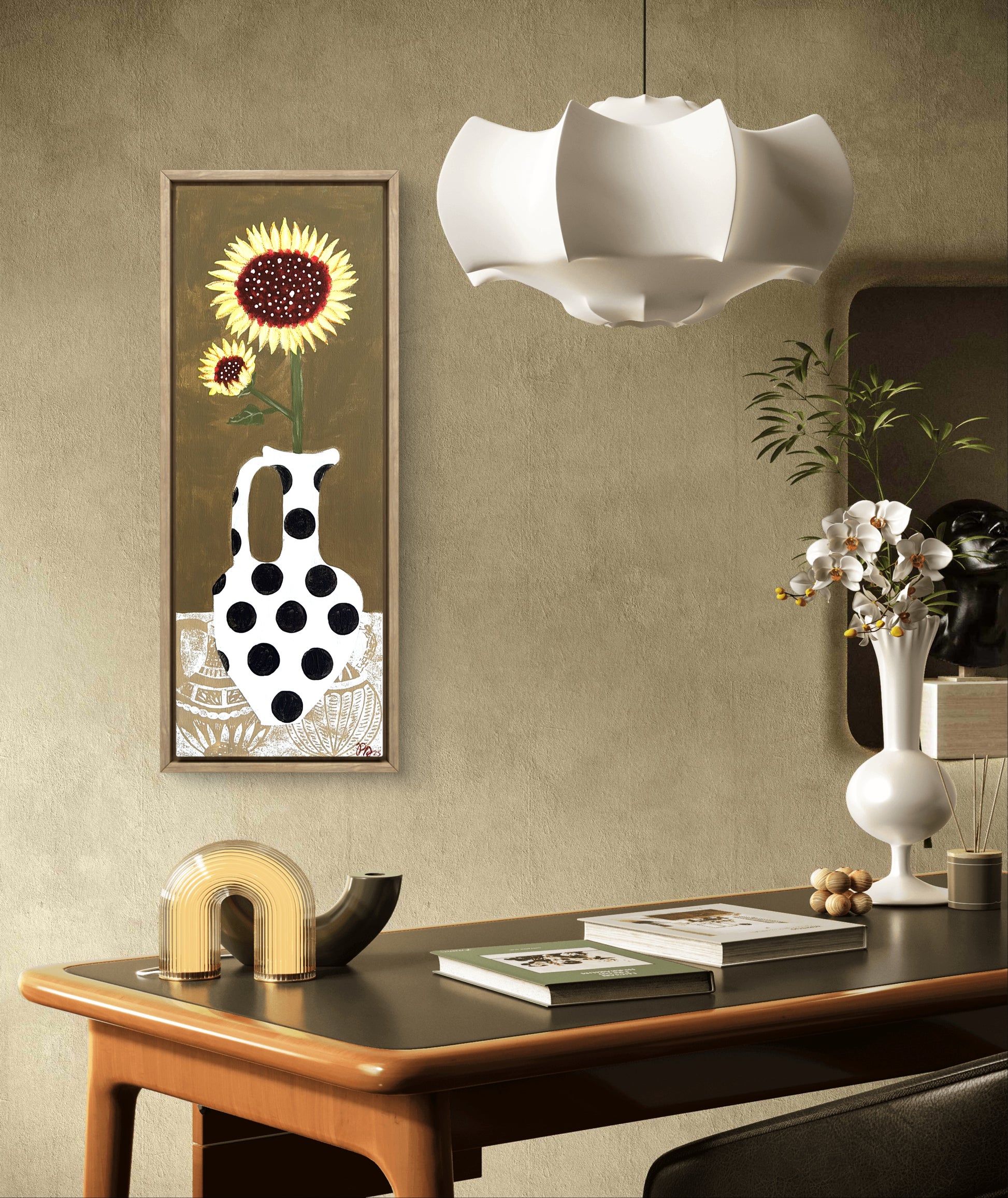 A vase of sunflowers is playfully set against a polka dot background, created with Paula’s hand-block printing. Acrylics and oil pastels add depth and texture. Available individually or as part of a collection of three.