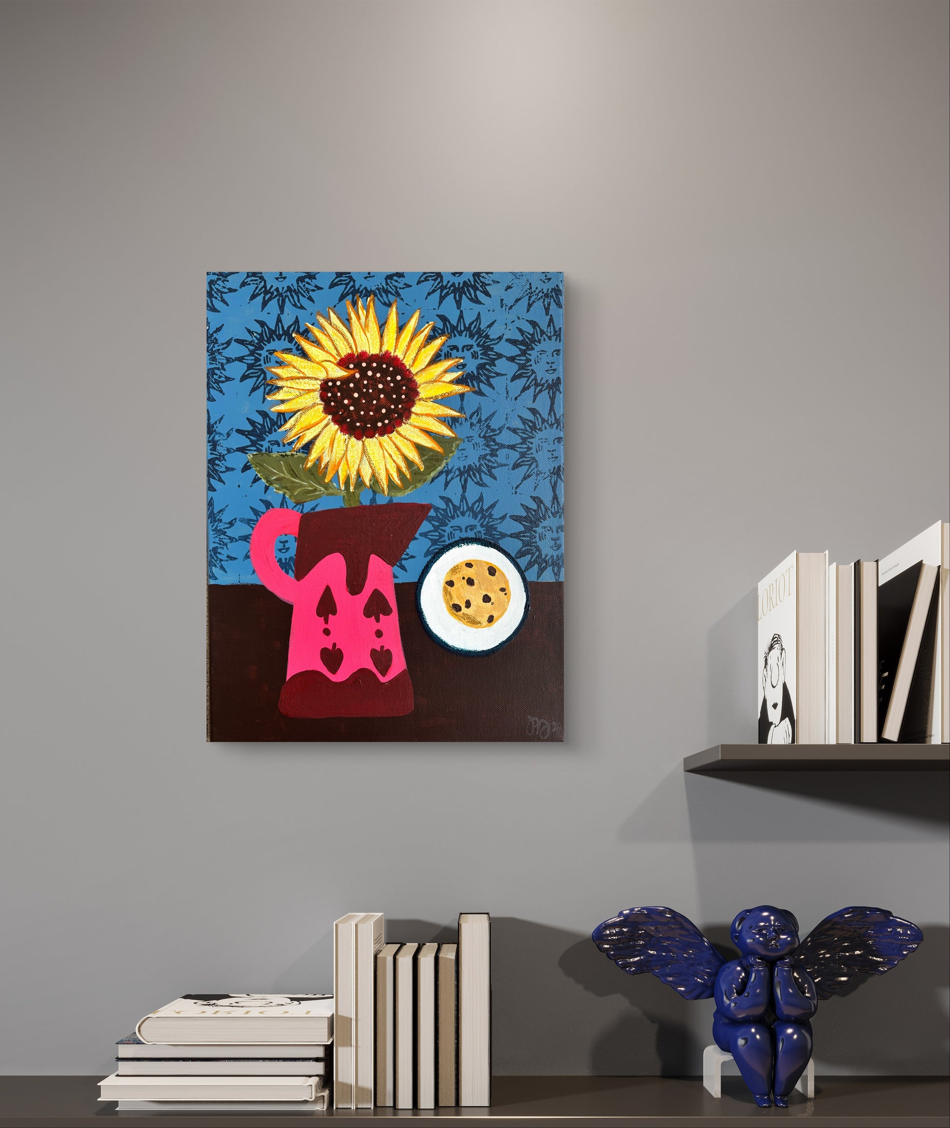 A playful pairing of sunflowers and a cookie, brought to life through Paula’s hand-block printing. Acrylics and oil pastels give the canvas a textured, vibrant finish.