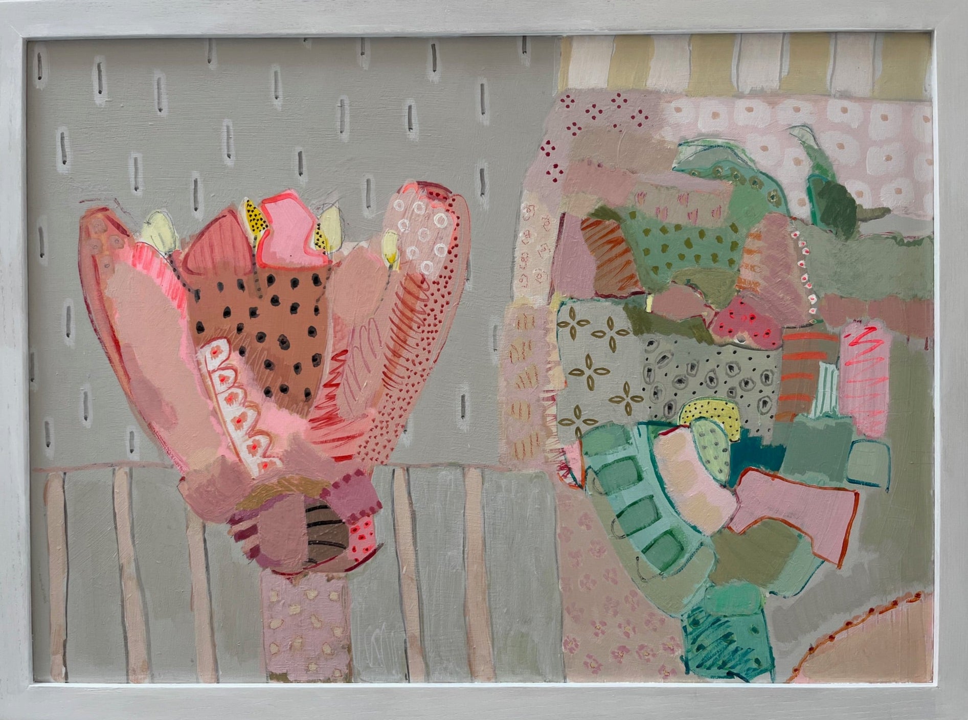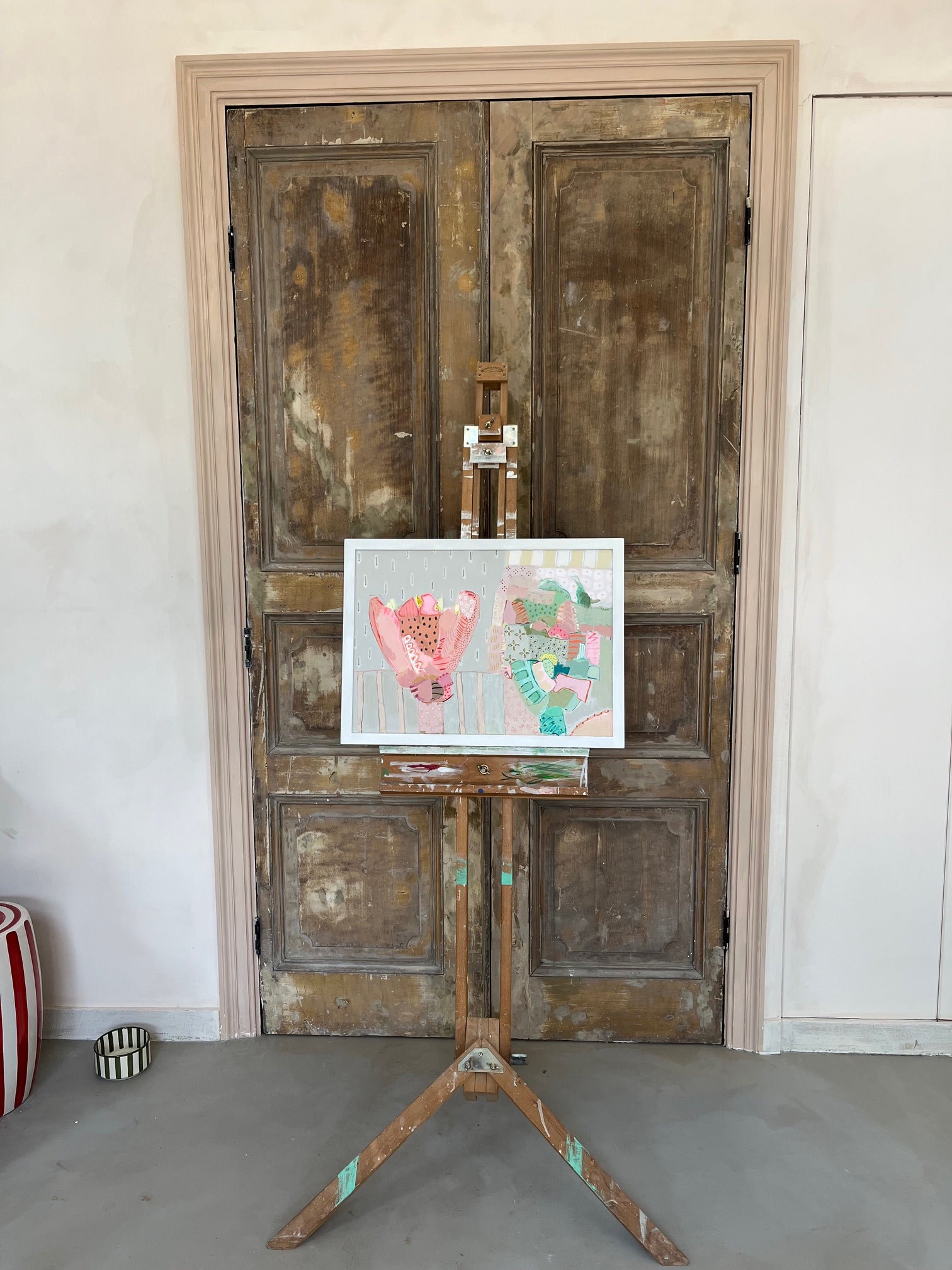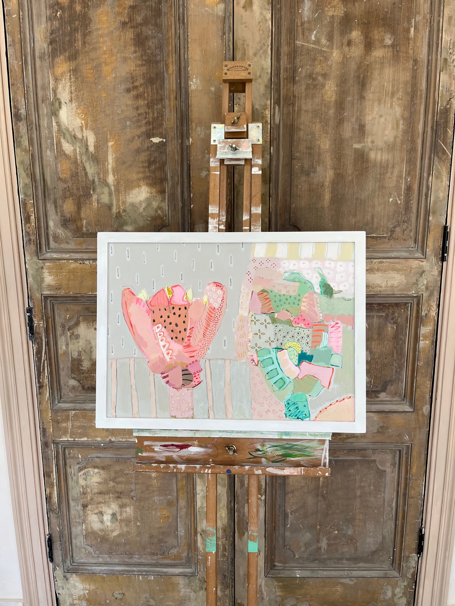 Once upon a time, artist Philippa Jeffrey worked in the world of fashion + magazines but it was when she moved out of London that she decided to return to her roots and become an artist. She now paints from her Oxfordshire studio: using botanical prints as a starting point, Philippa has developed a unique visual language, celebrating layers of colour, pattern and mark-making. Her most recent works are inspired by summer road trips, largely through the cotswolds and the southern coast of Ireland. Abstracted landscapes… a visual candy as opposed to an overly verbalised aesthetic. She uses water based paints and a combination of board and canvas. Philippa has also extensively renovated her family home and has applied her love of pattern and colour to countless interior & decorative projects.