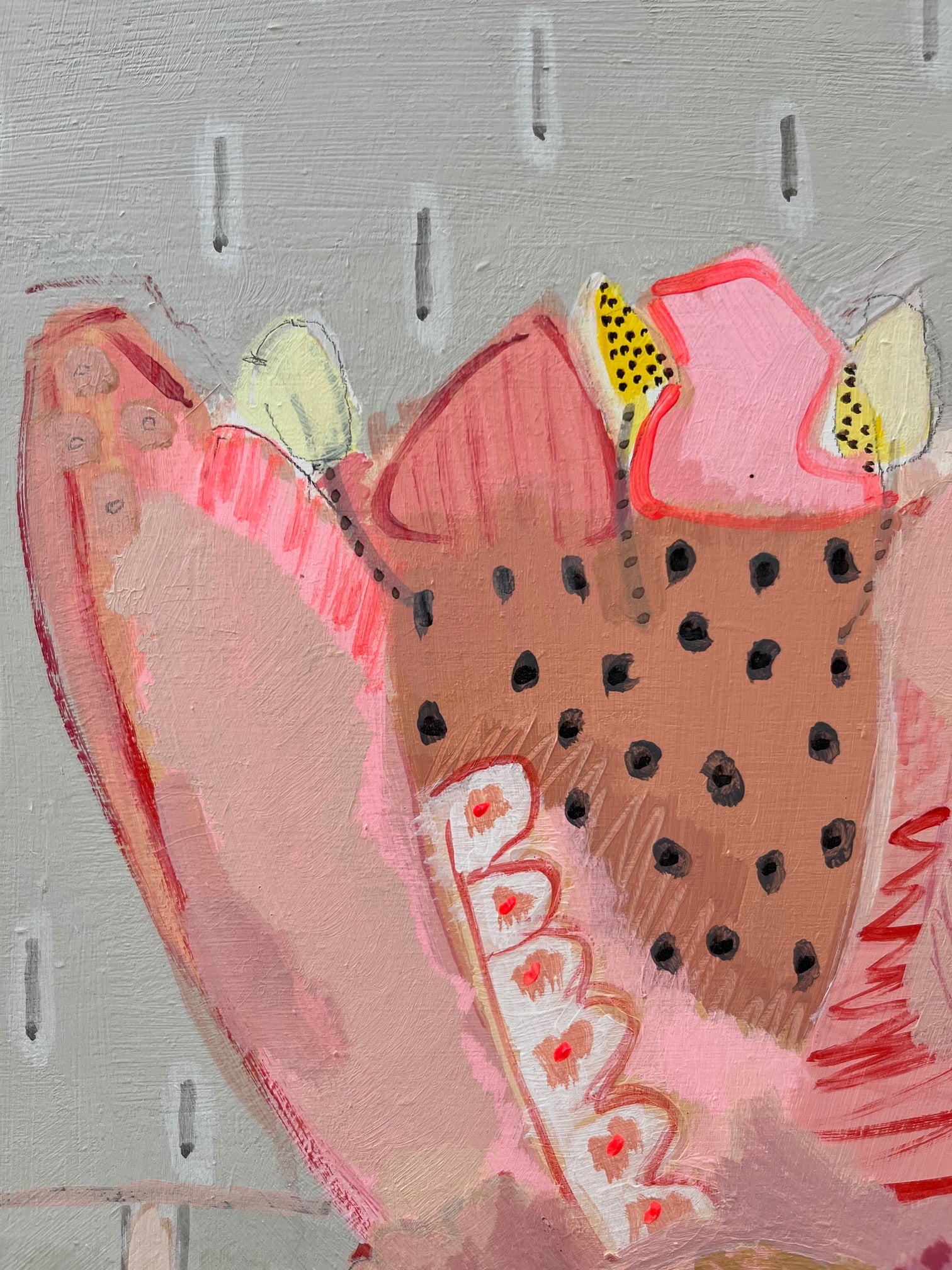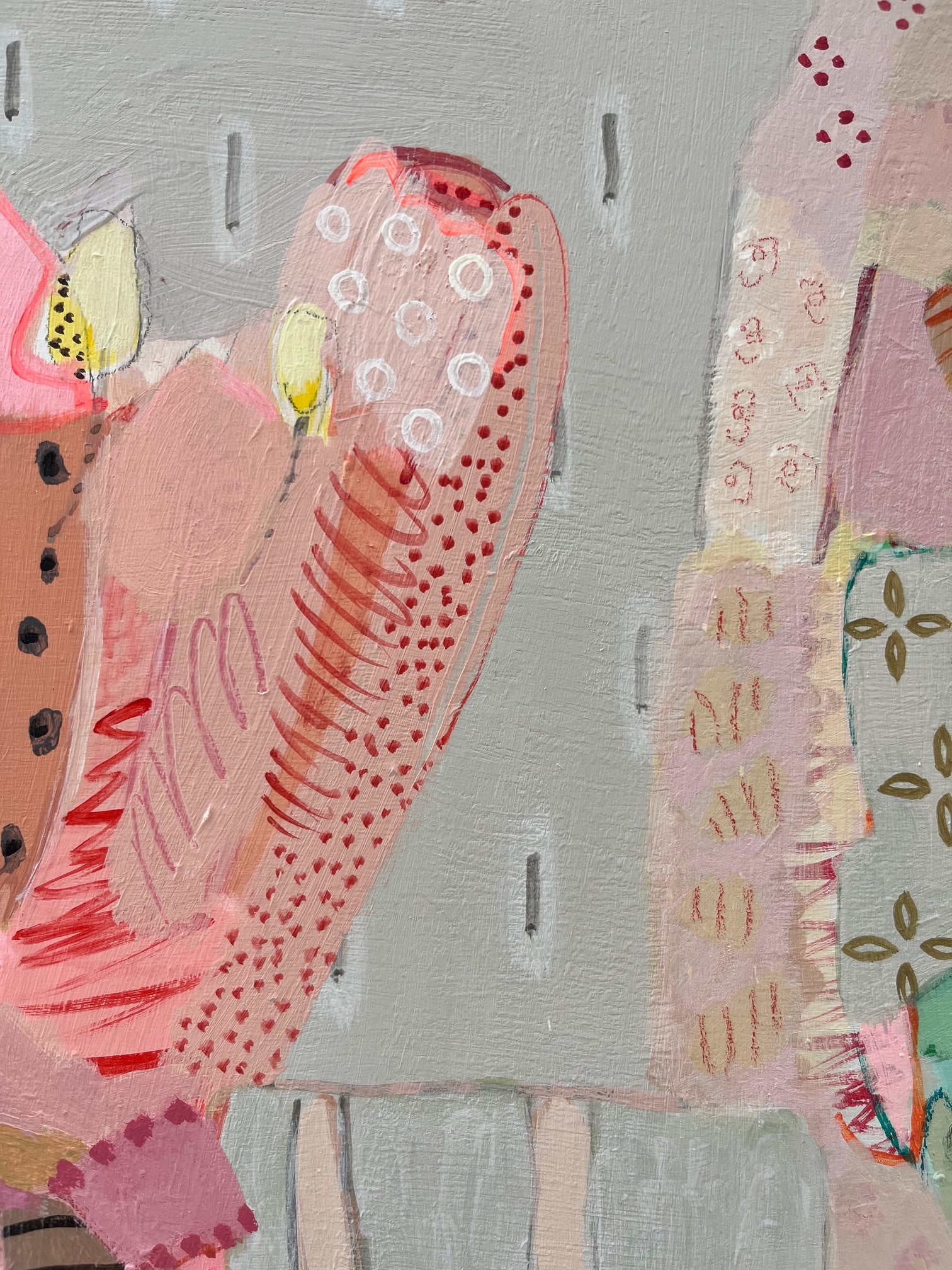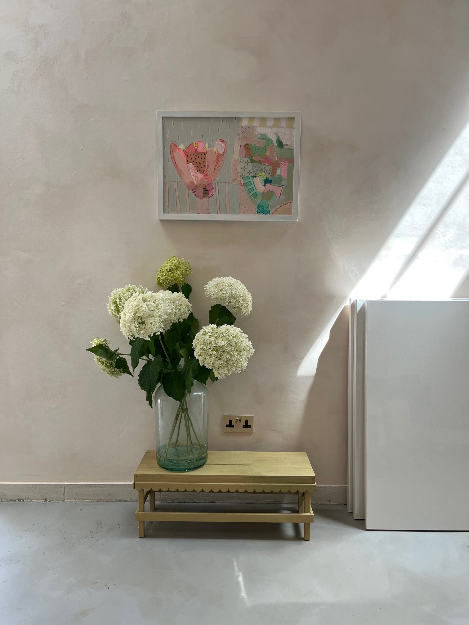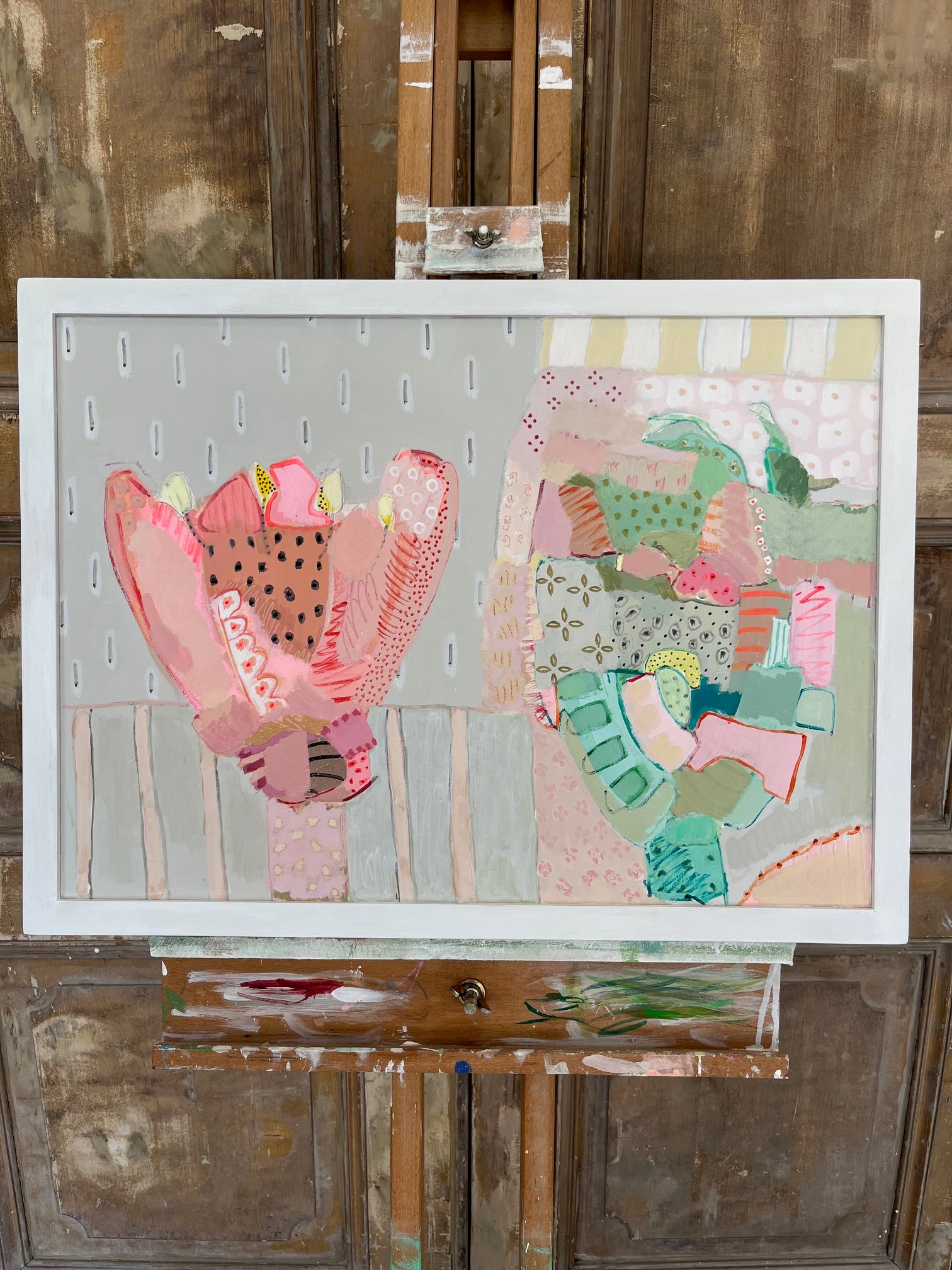 Once upon a time, artist Philippa Jeffrey worked in the world of fashion + magazines but it was when she moved out of London that she decided to return to her roots and become an artist. She now paints from her Oxfordshire studio: using botanical prints as a starting point, Philippa has developed a unique visual language, celebrating layers of colour, pattern and mark-making. Her most recent works are inspired by summer road trips, largely through the cotswolds and the southern coast of Ireland. Abstracted landscapes… a visual candy as opposed to an overly verbalised aesthetic. She uses water based paints and a combination of board and canvas. Philippa has also extensively renovated her family home and has applied her love of pattern and colour to countless interior & decorative projects.