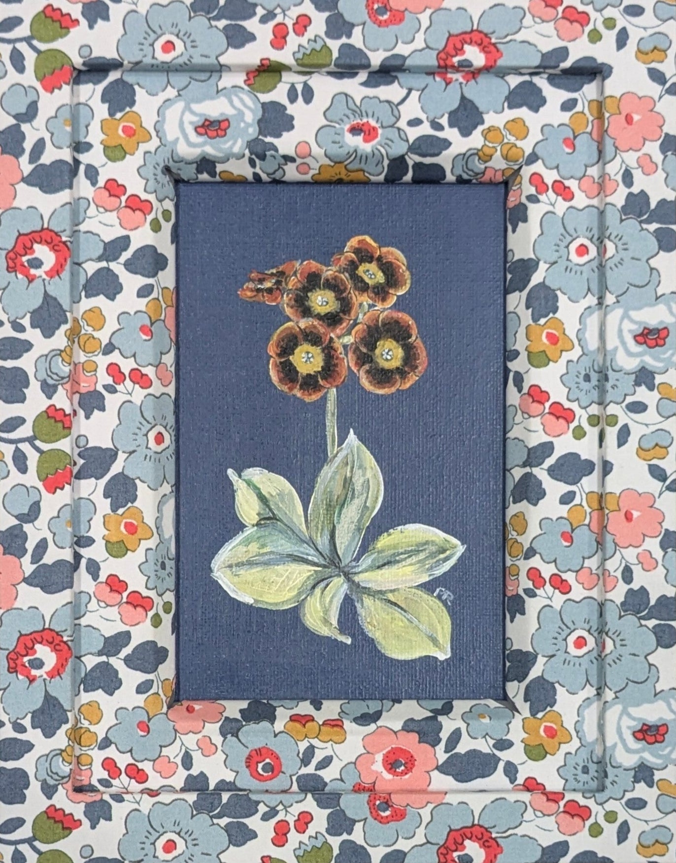 Polly Ruffman is a lifelong doodler and artist who lives in Somerset. She paints playful studies of flowers and nature, and presents them in frames and mounts she has covered by hand in fabric. A consistent colour palette across her work means that all the pieces (hopefully!) compliment one another.