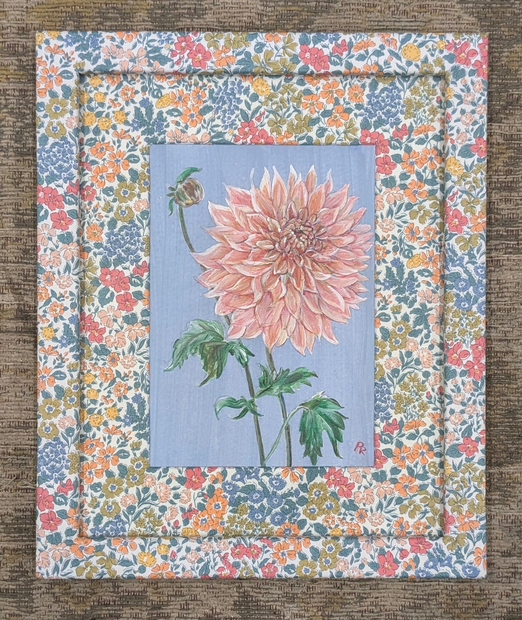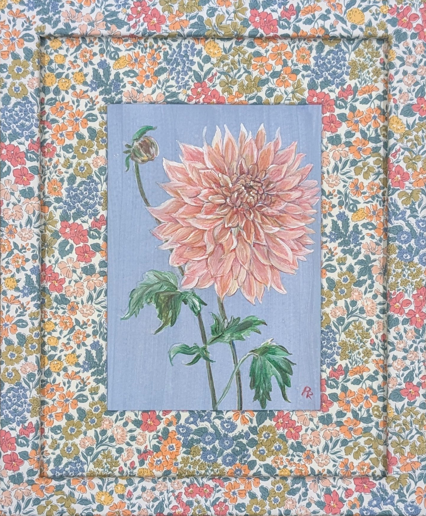 Polly Ruffman is a lifelong doodler and artist who lives in Somerset. She paints playful studies of flowers and nature, and presents them in frames and mounts she has covered by hand in fabric. A consistent colour palette across her work means that all the pieces (hopefully!) compliment one another.