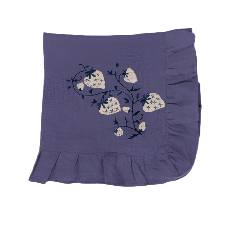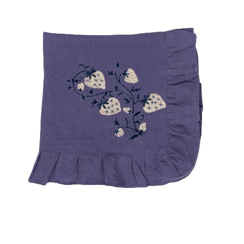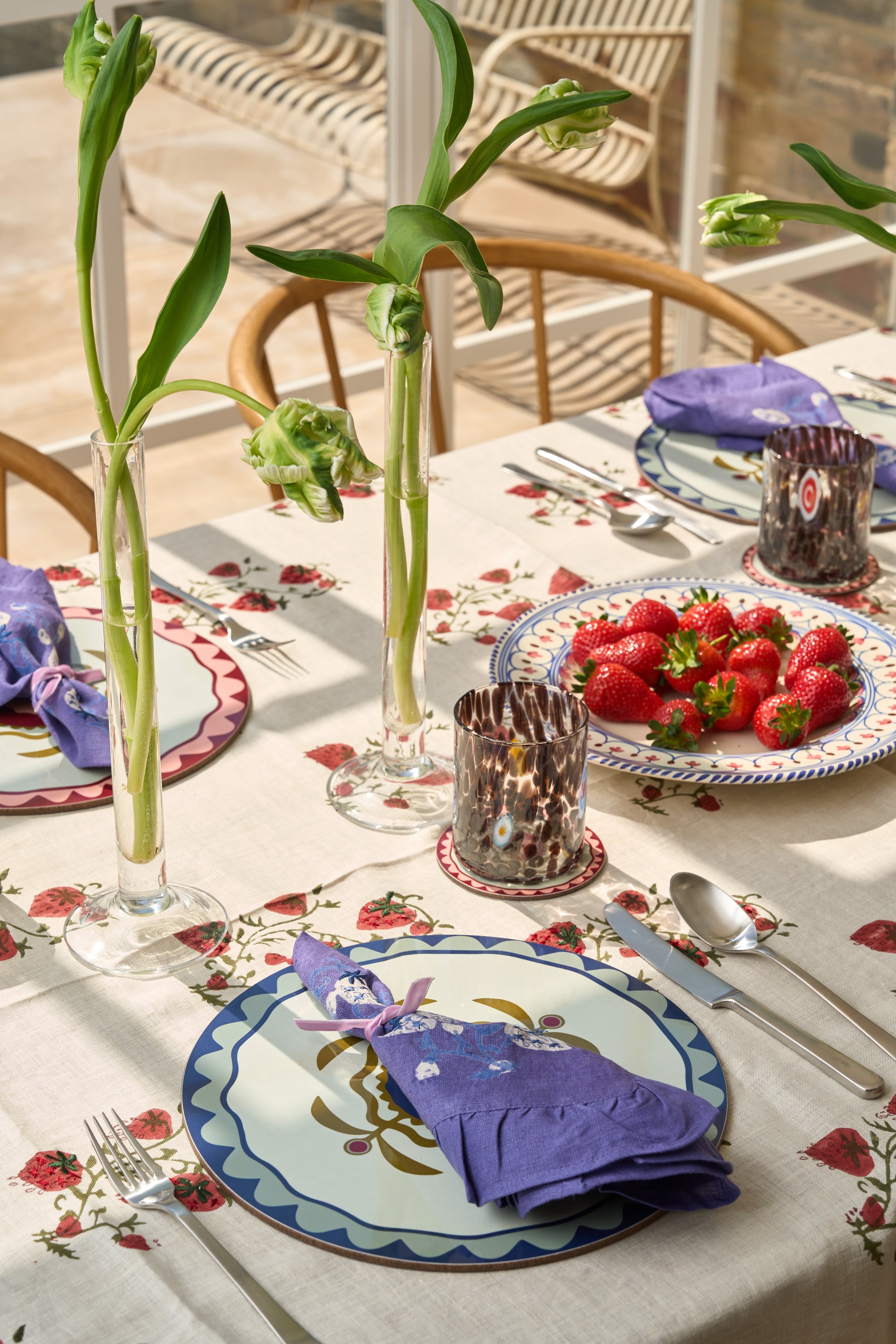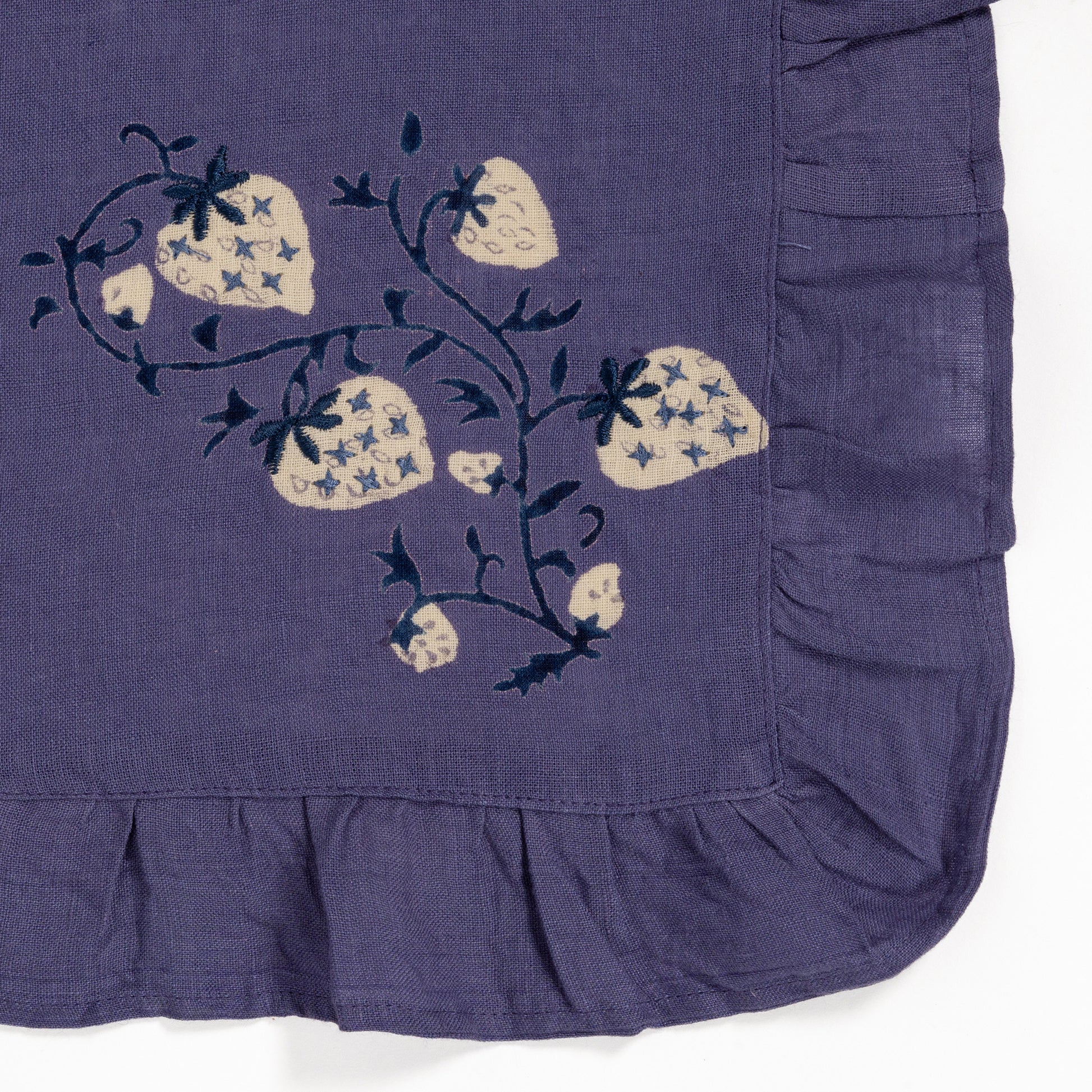 Inspired by a vintage Suzani, Sharland England's Fraise de bois collection features an intricate hand-blocked pattern layered with hand-cross-stitching. The borders feature a whimsical ruffle, and the whole piece is made from custom hand-loomed linen. This is artisanal work at its finest, and we hope you love the beautiful centrepiece on your table.
