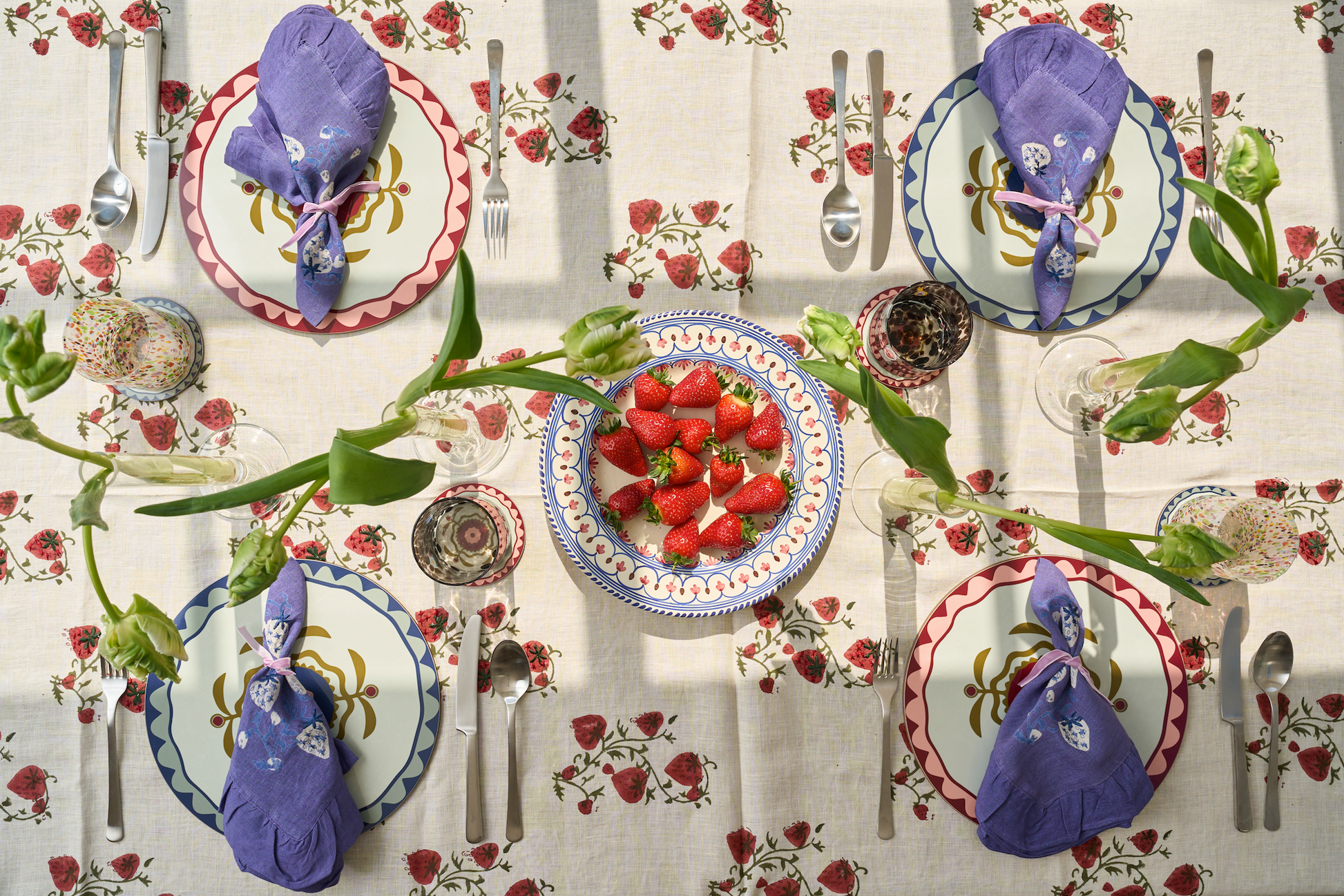 Inspired by a vintage Suzani, Sharland England's Fraise de bois collection features an intricate hand-blocked pattern layered with hand-cross-stitching. The borders feature a whimsical ruffle, and the whole piece is made from custom hand-loomed linen. This is artisanal work at its finest, and we hope you love the beautiful centrepiece on your table.