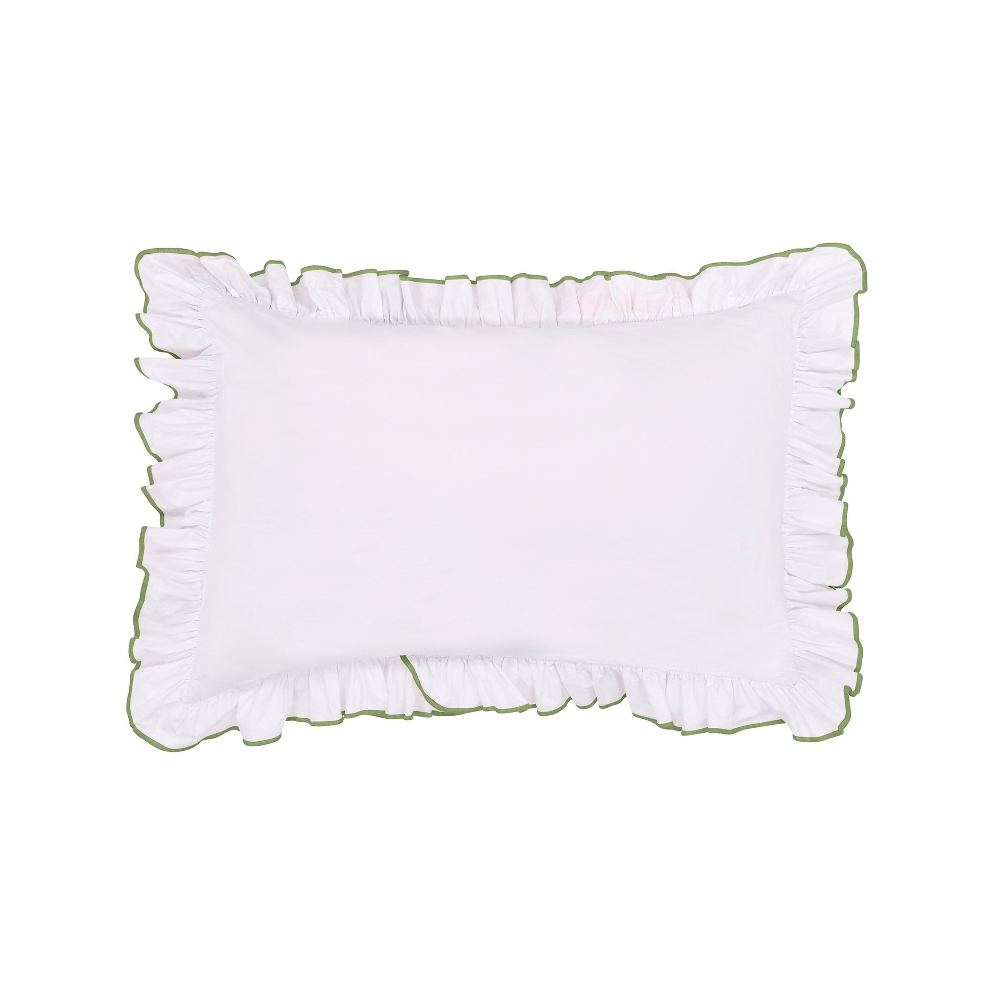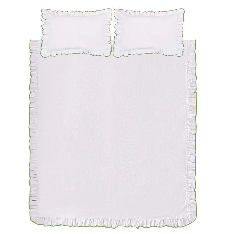 Introducing our enchanting Provence-inspired bundle set. A dreamy frill edged with Olive thread across the pillow cases and three sides of the duvet cover. Where dreams meet French elegance. Immerse yourself in a world of whimsical charm and romantic allure as you indulge in the rich, buttery soft cotton sateen bed set.