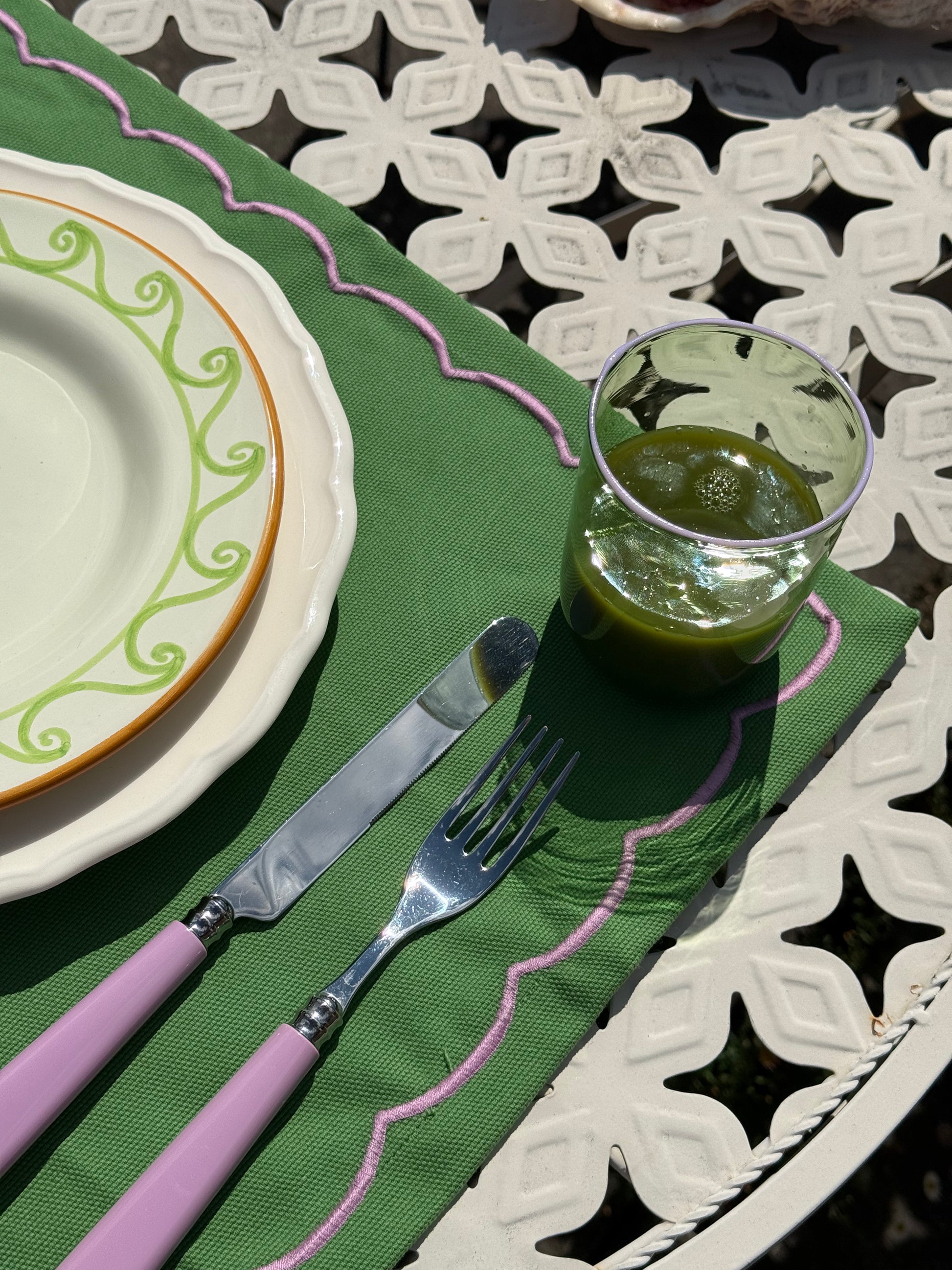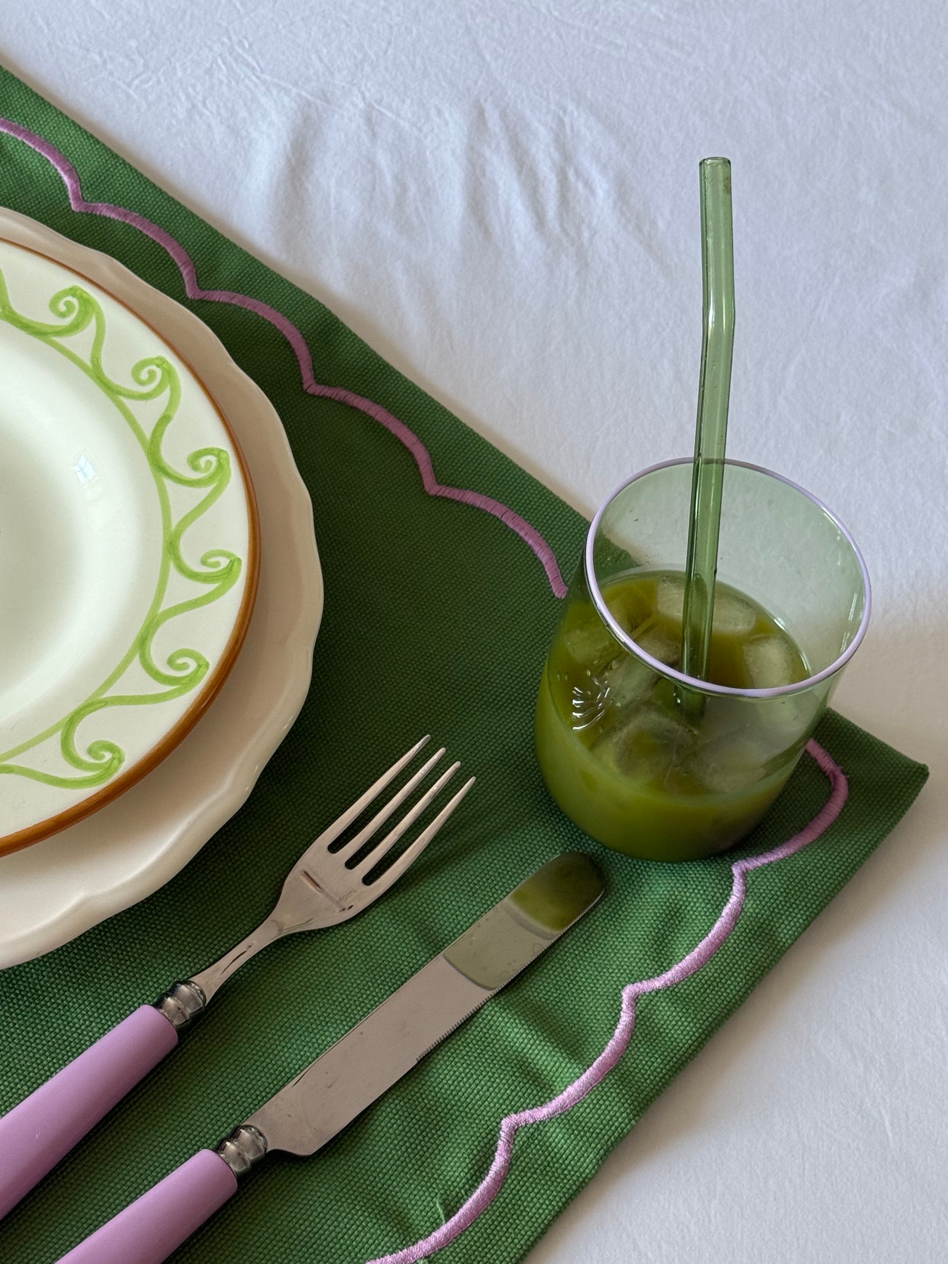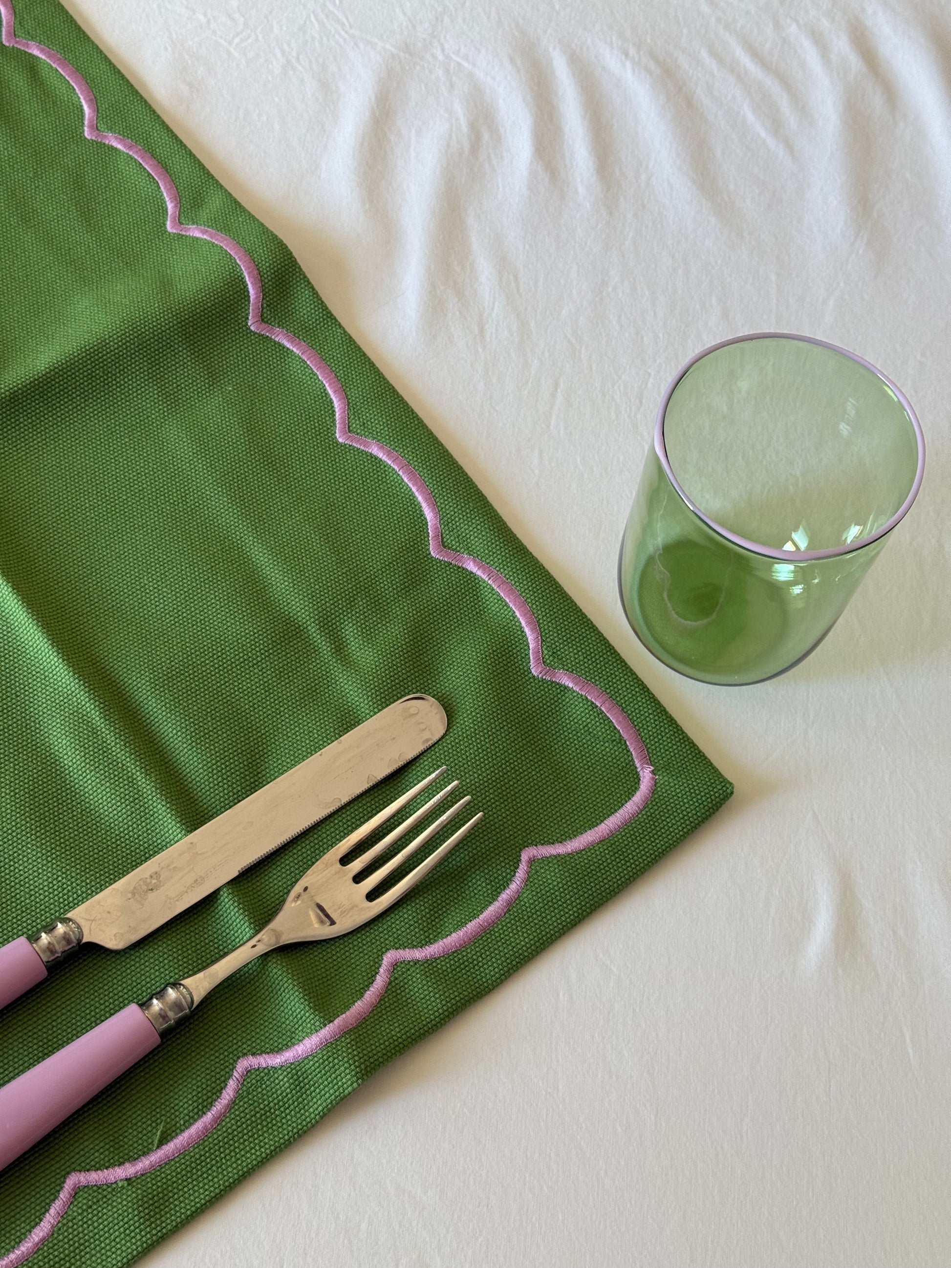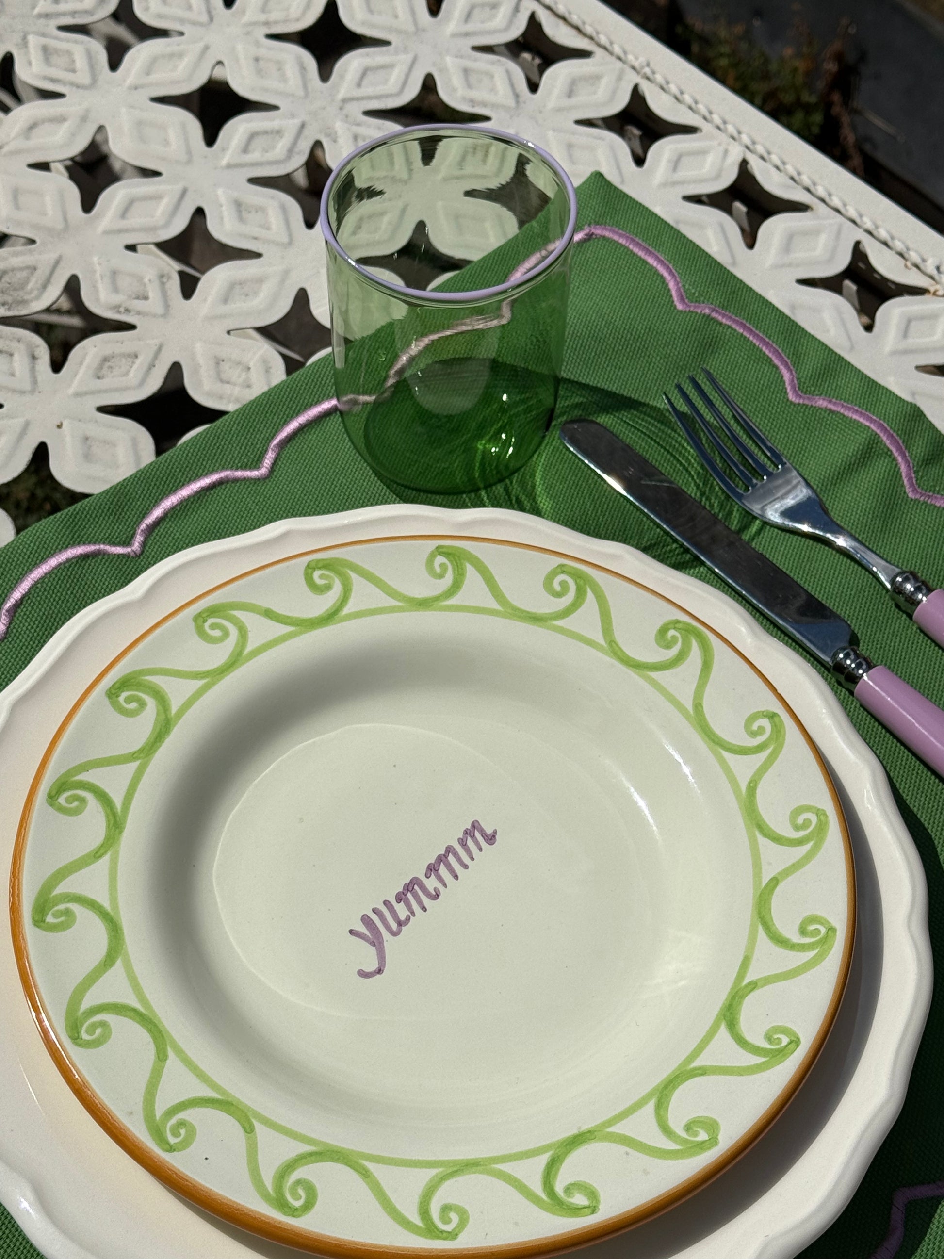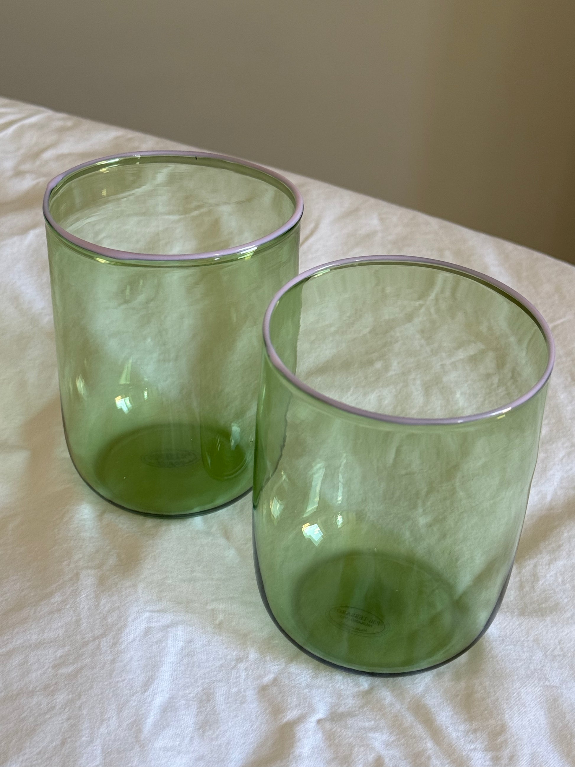 We have designed these beautiful Venetian glasses just for you! Intricately made by artisans in Venice, they have been designed with care and precision. We've added our touch with our DM pink and green too.